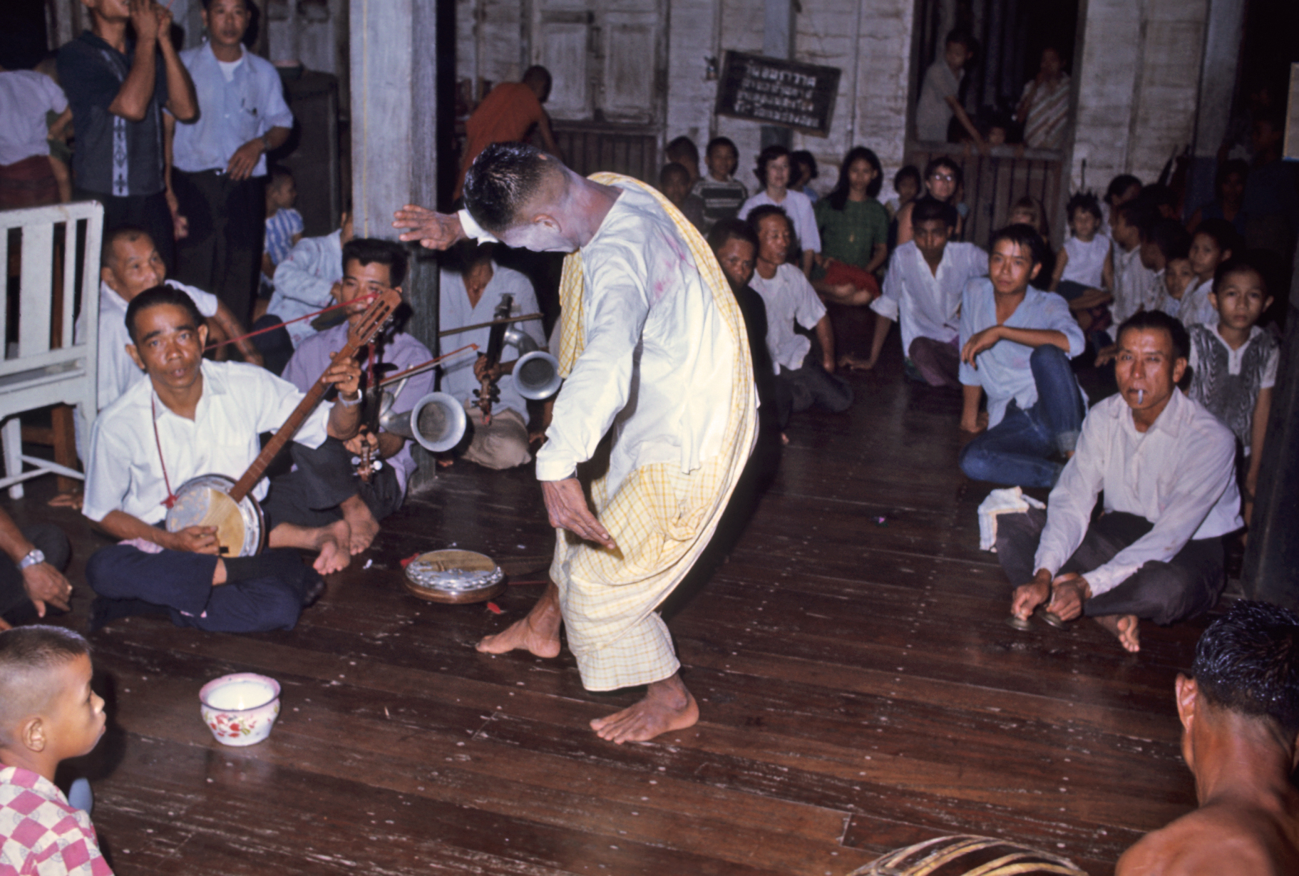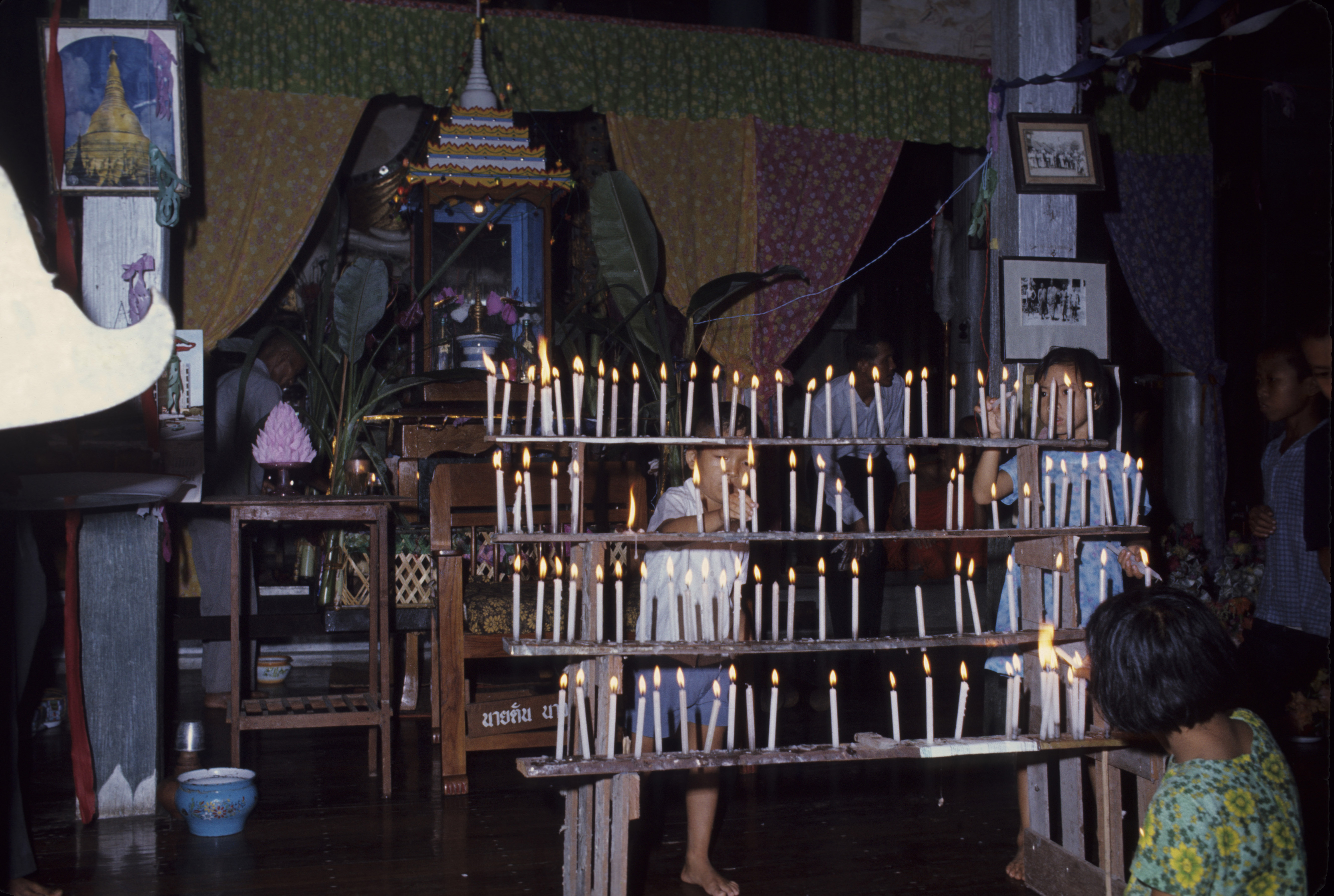 Thousand candle procession – at Wat Ommarawat: dancers, offering, offering inside Wat (children placing candles), congregation, lay people offerings and abbot of wat, 9 photos, Amphoe Mae Sariang, Changwat Mae Hong Son, Thailand, October 1968