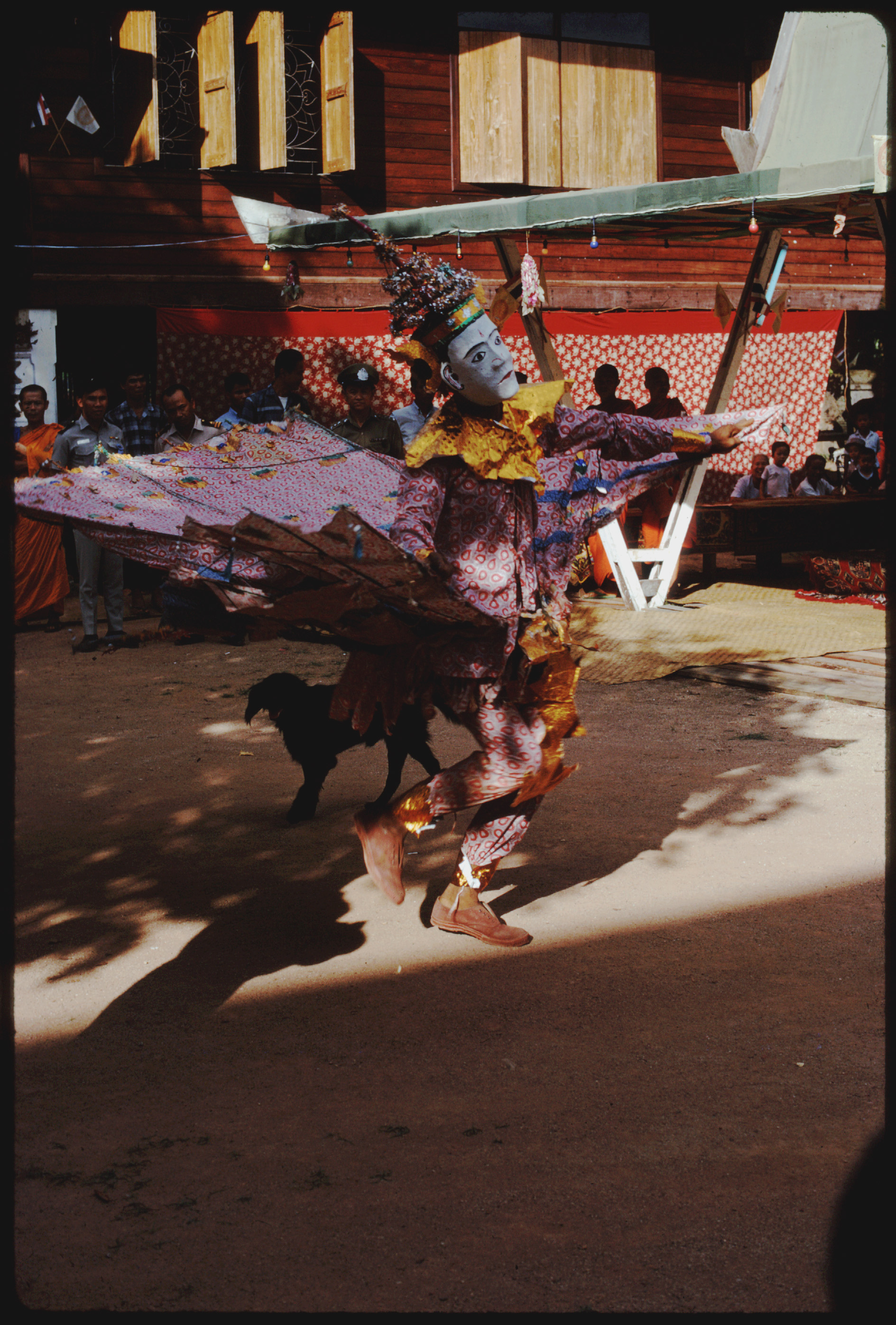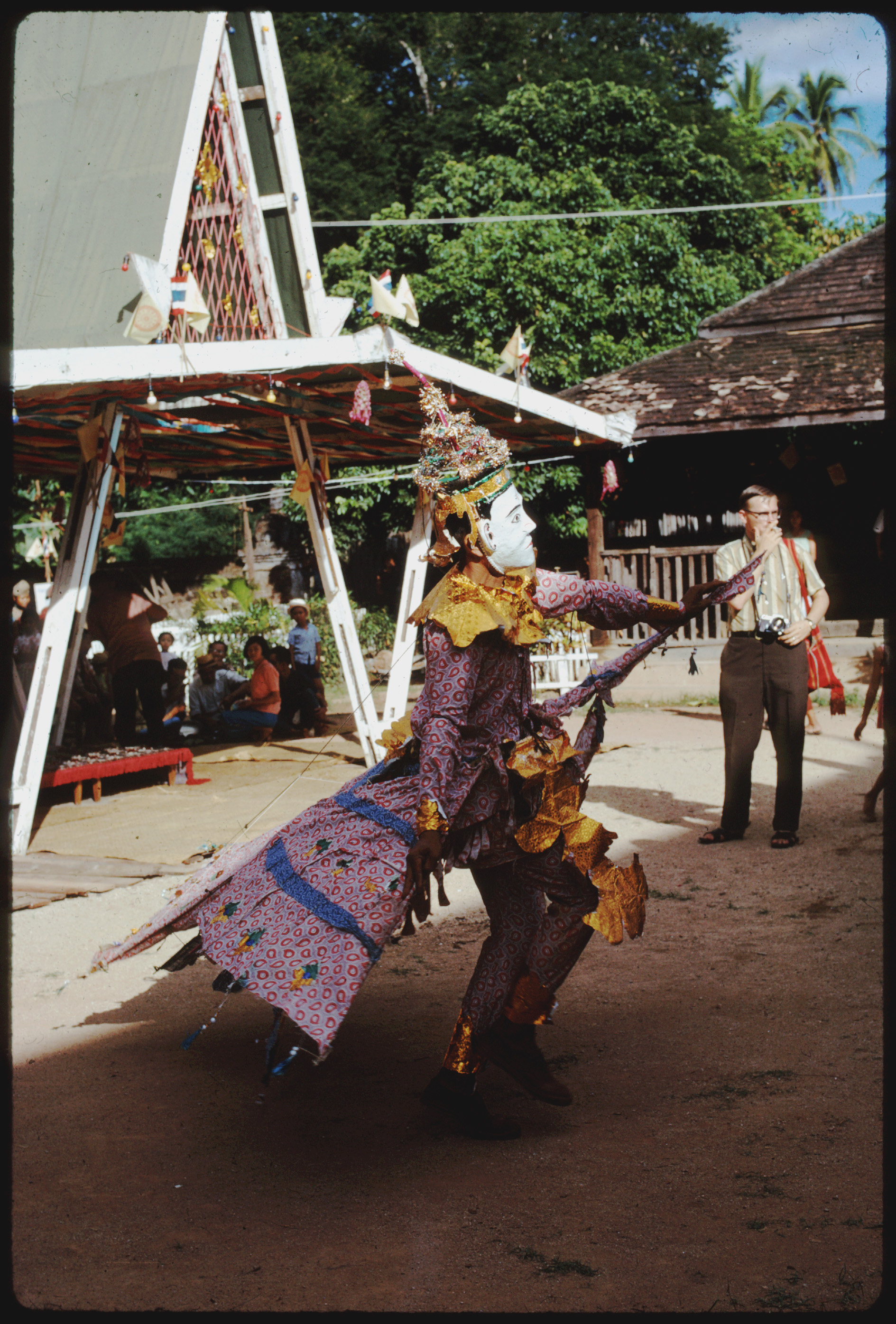 Phā pā, rite of presenting robes for monks, organized by artists from Bangkok at Wat Kittiwong – Shan butterfly dancer (with CKA in background), 4 photos, Amphoe Mae Sariang, Changwat Mae Hong Son, Thailand, December 1967