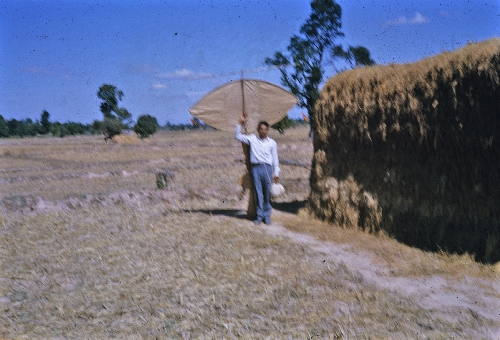 Man with kite near stack of harvested rice, Ban Nong Tun village, A. Muang, Changwat Maha Sarakham, December 1963