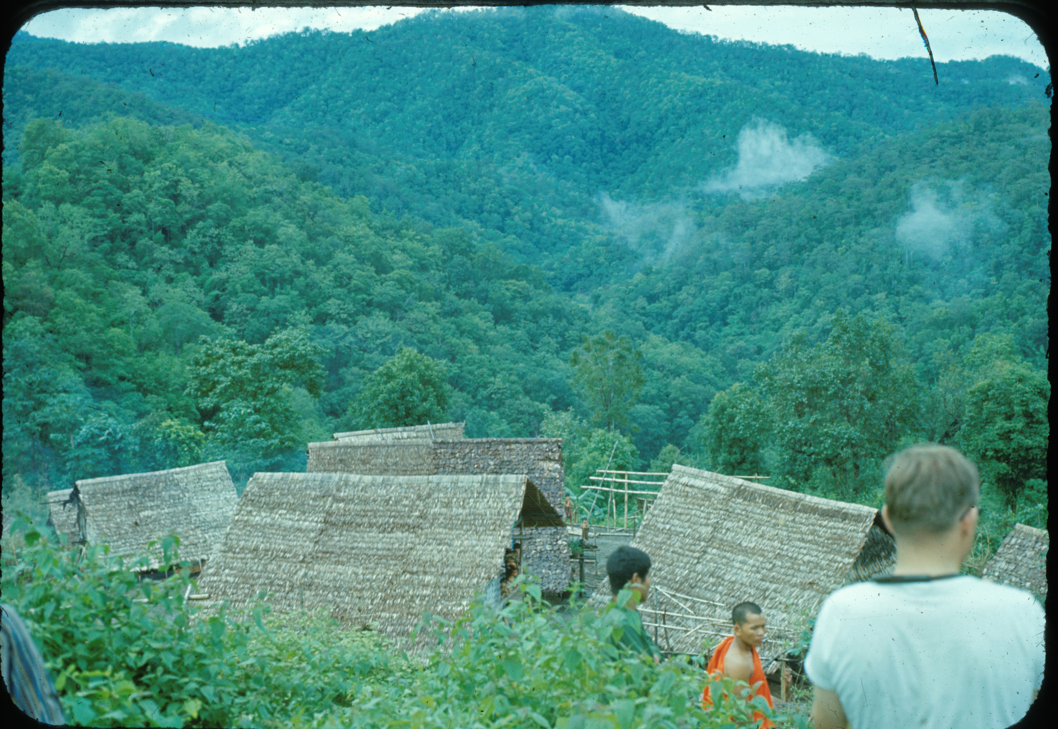 Trip to Salween to find old palm leaf manuscripts (bailān) -- Bān Khun Māē Tôp village with Biff (Charles F. Keyes) in foreground, Ban Khun Mae Top, Thambon Ban Kat, Amphoe Mae Sariang, Changwat Mae Hong Son, Thailand, June 1968