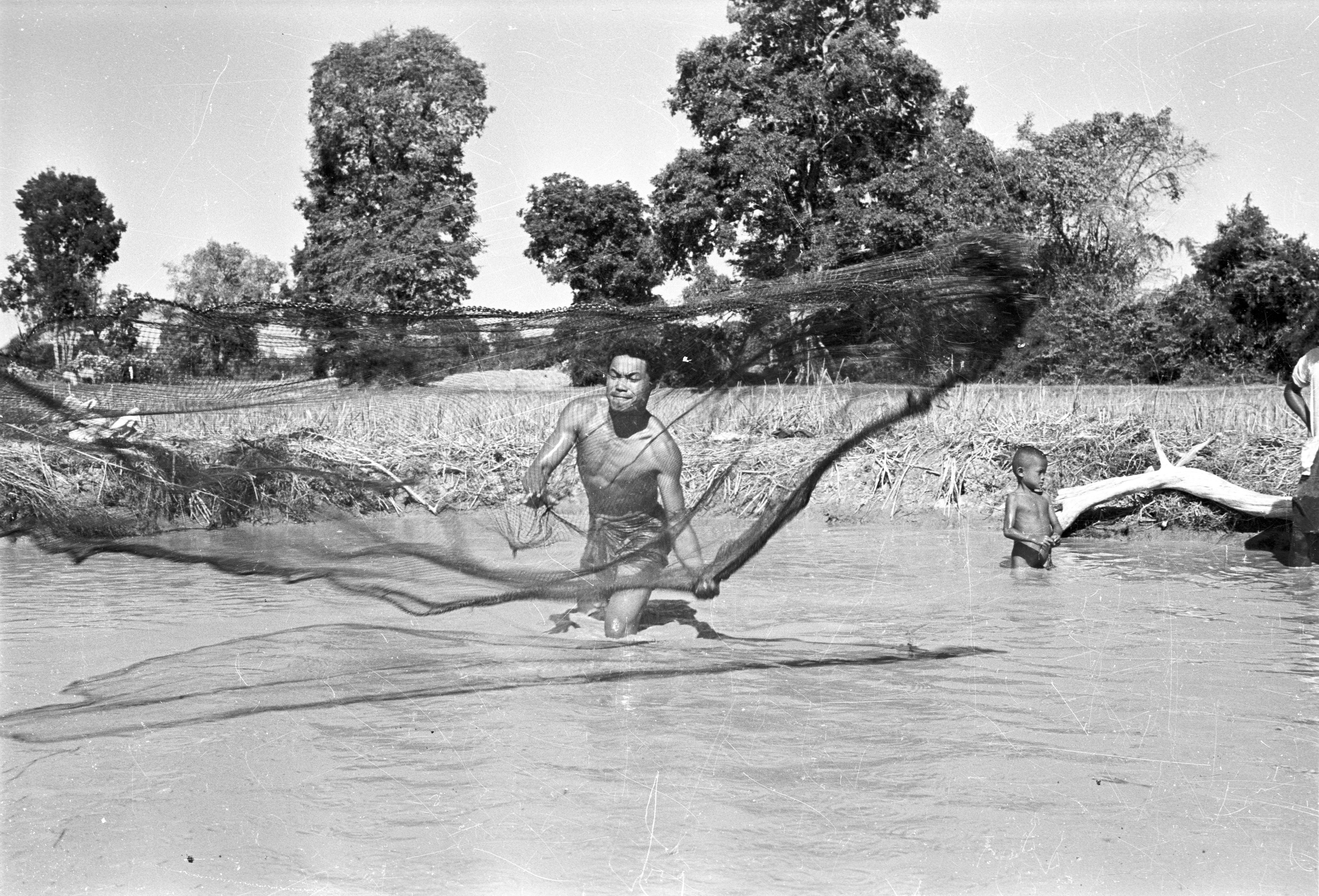 Village man casting a large circular net (thôt hāē) to catch fish in a pond, Changwat Maha Sarakham, Thailand, January 1964