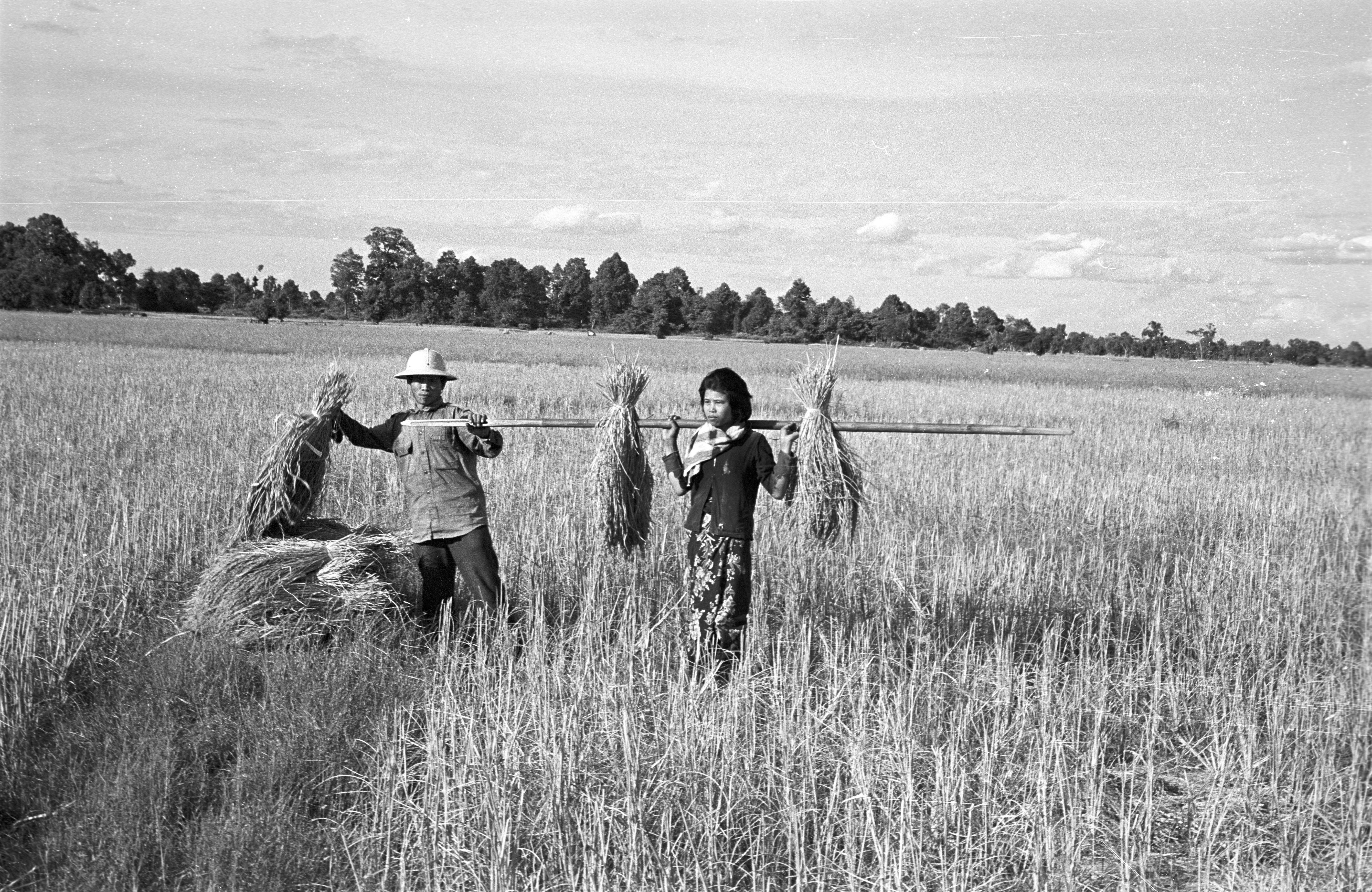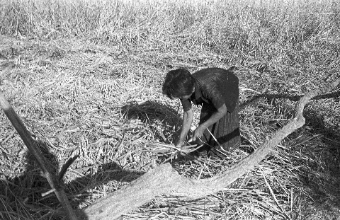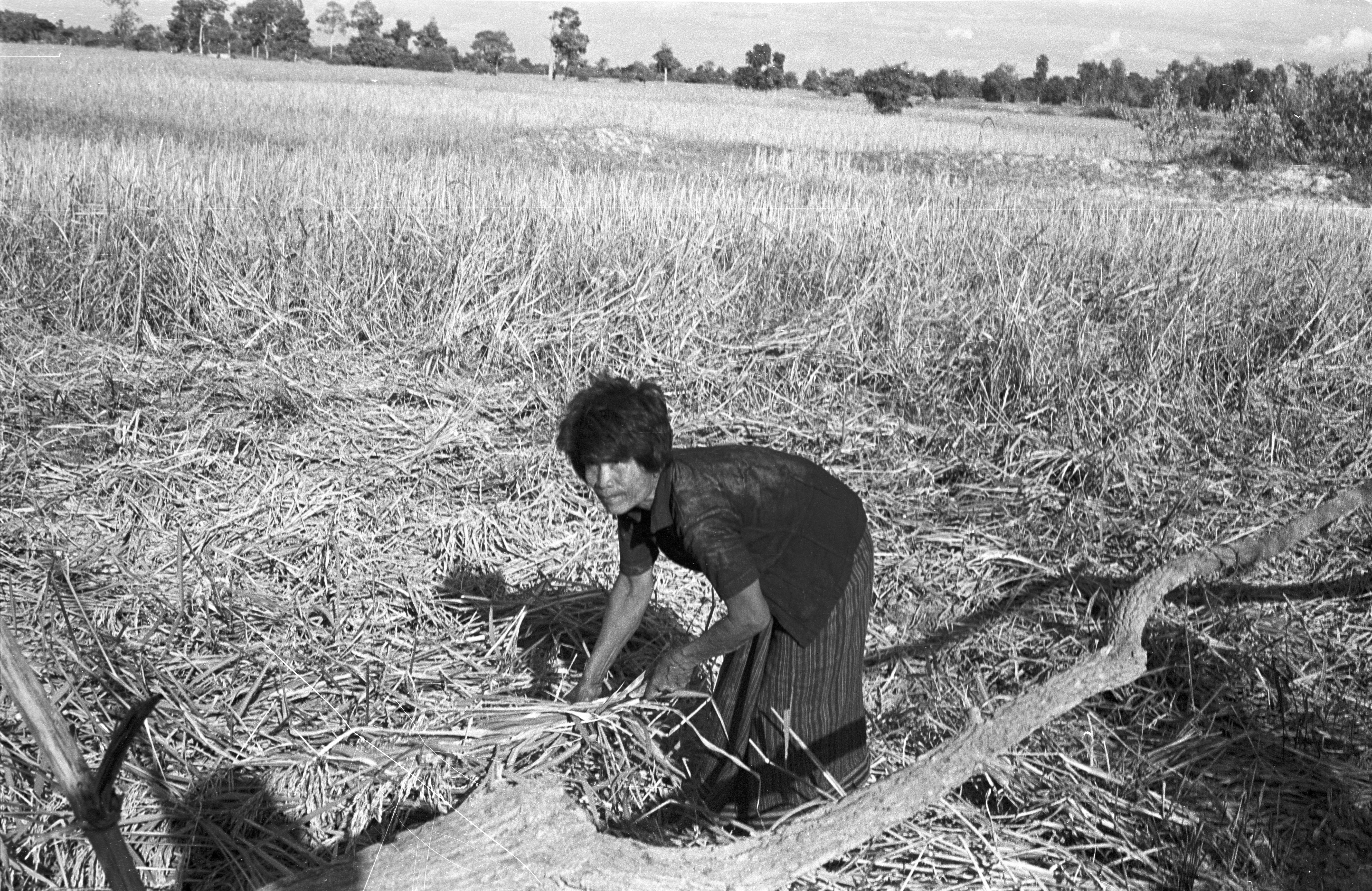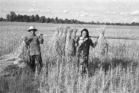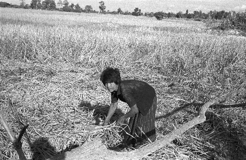 People harvesting rice: a woman, 2 photos; a couple, 2 photos; Ban Nong Tun, Amphoe Muang, Changwat Maha Sarakham, Thailand, December 1963