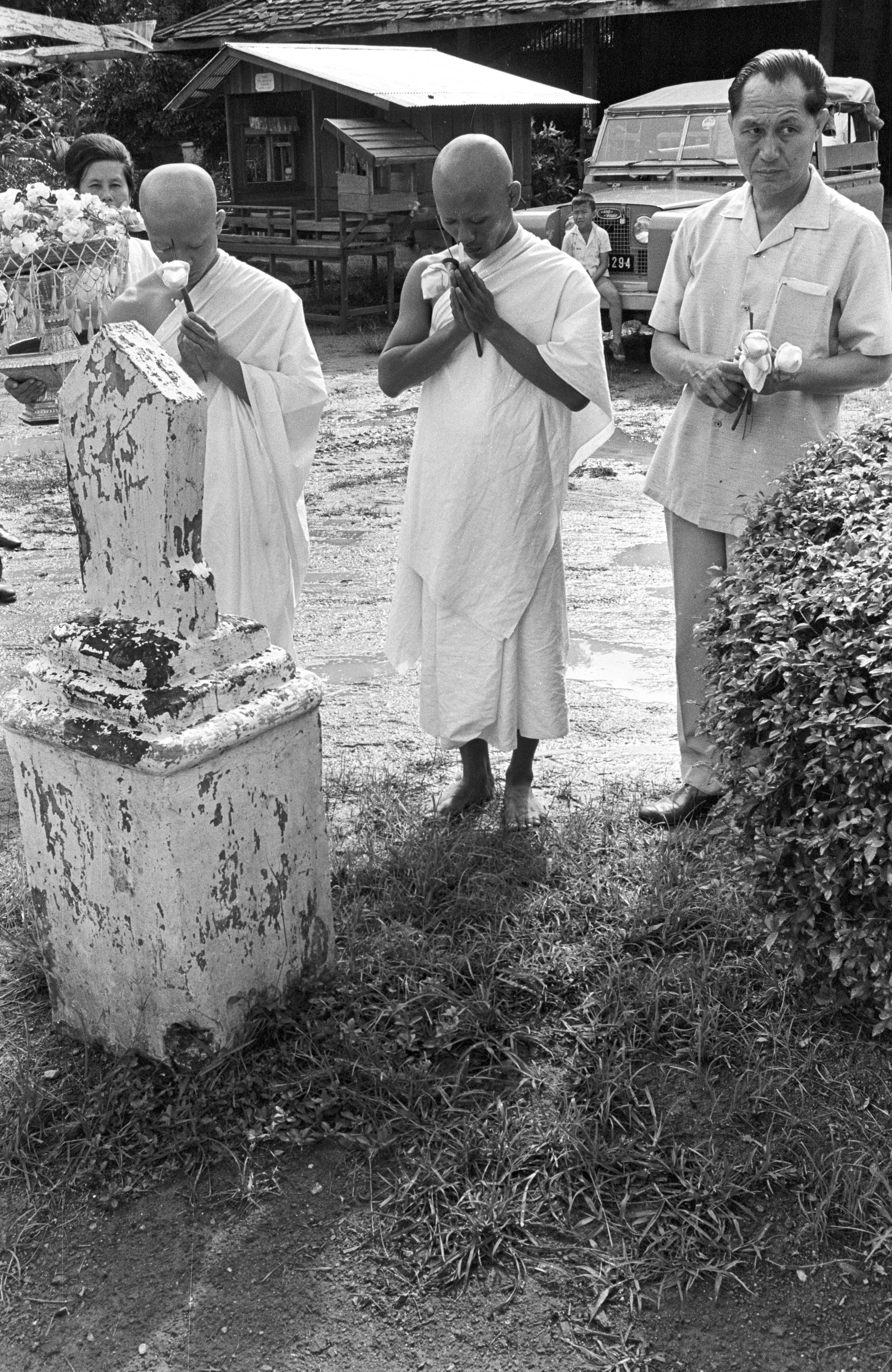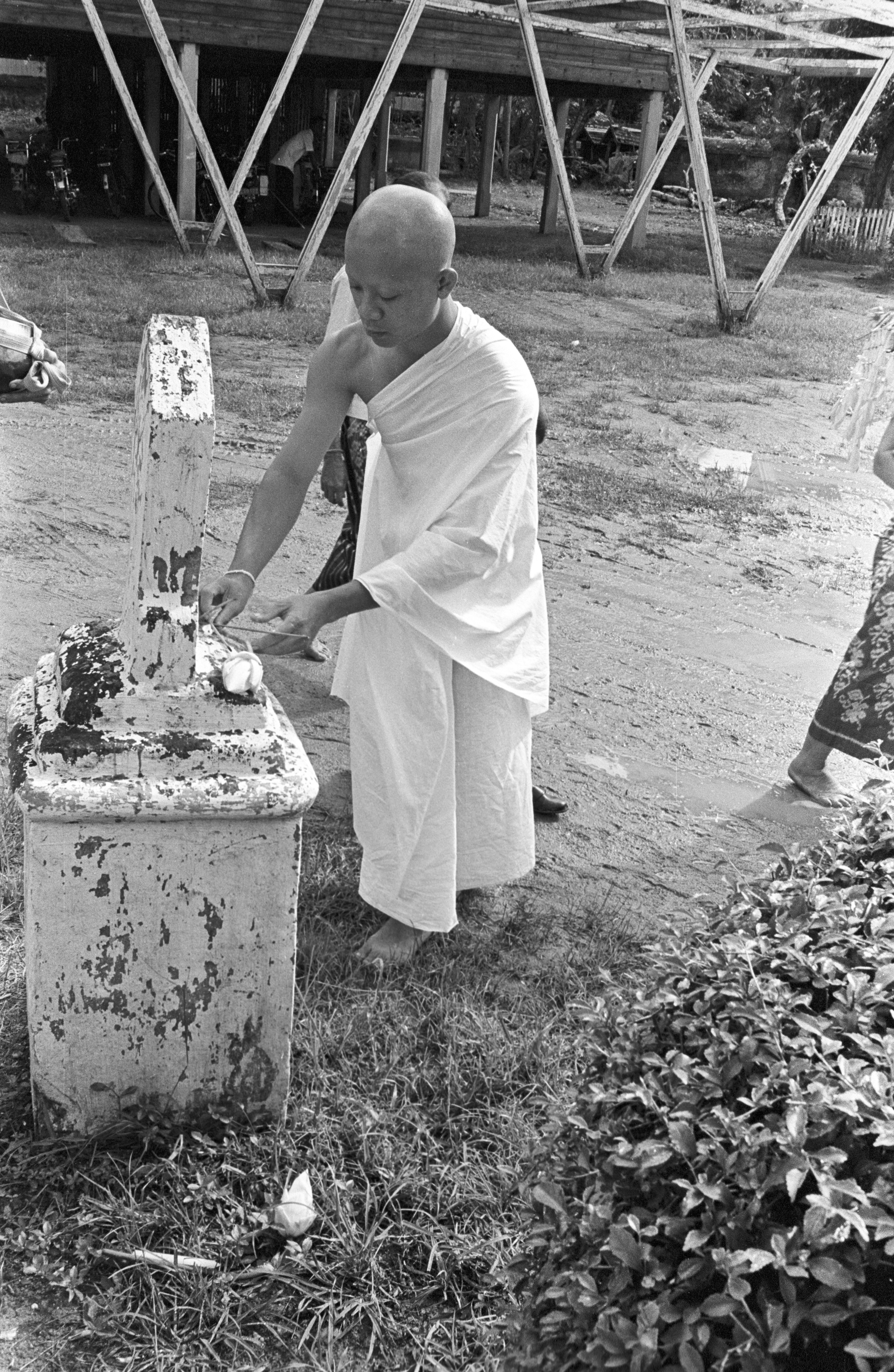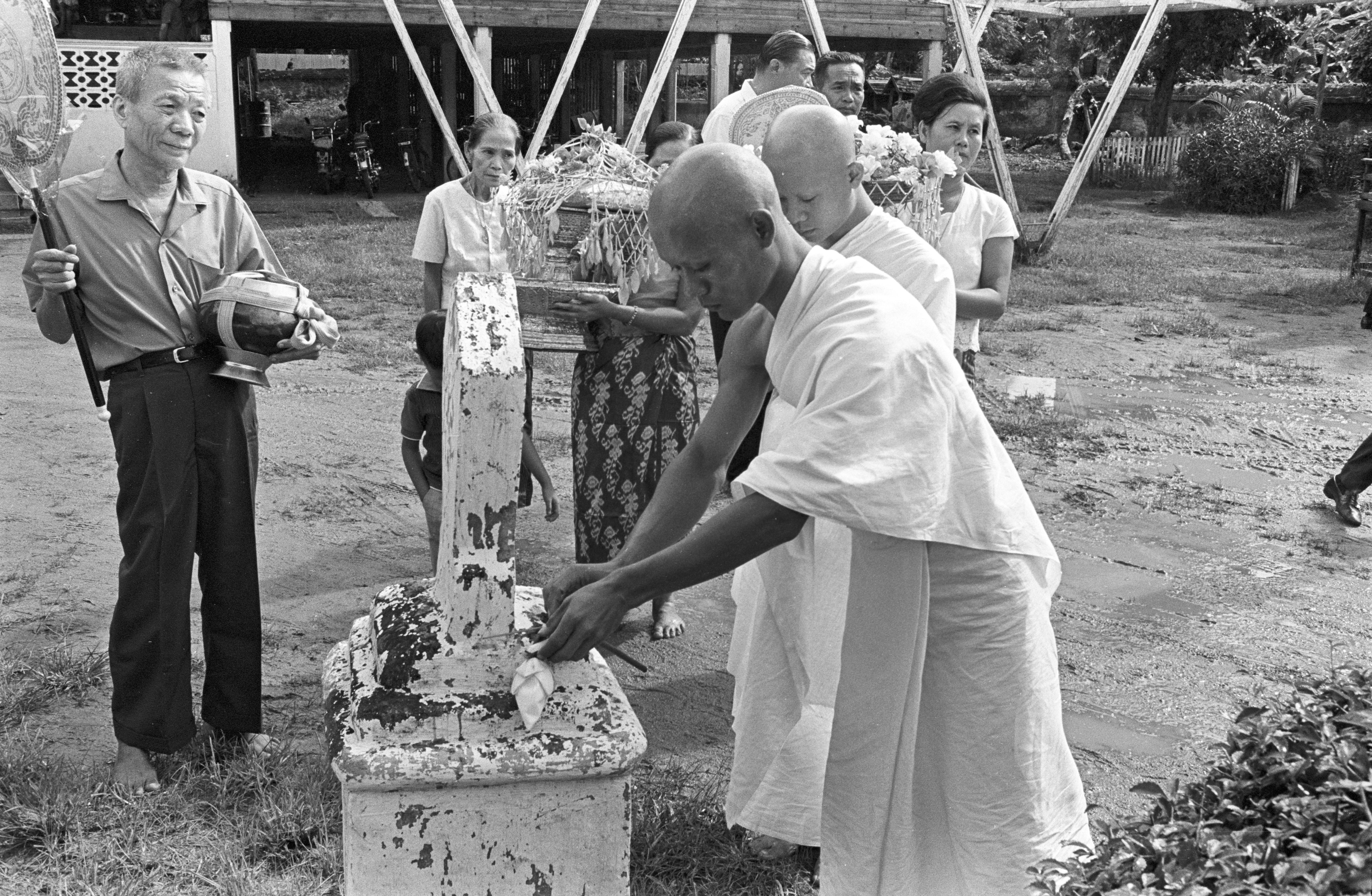 Wat Kittiwong: ordination -- candidates making offerings at boundary markers of ordination hall, 4 photos, Amphoe Mae Sariang, Changwat Mae Hong Son, Thailand, July 1968