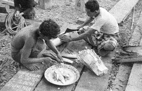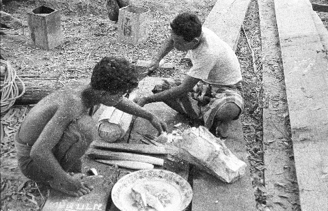 Village men cutting up heart of the palm tree, 2 photos, Ban Nong Tun, Amphoe Muang, Changwat Maha Sarakham, Thailand, December 1963