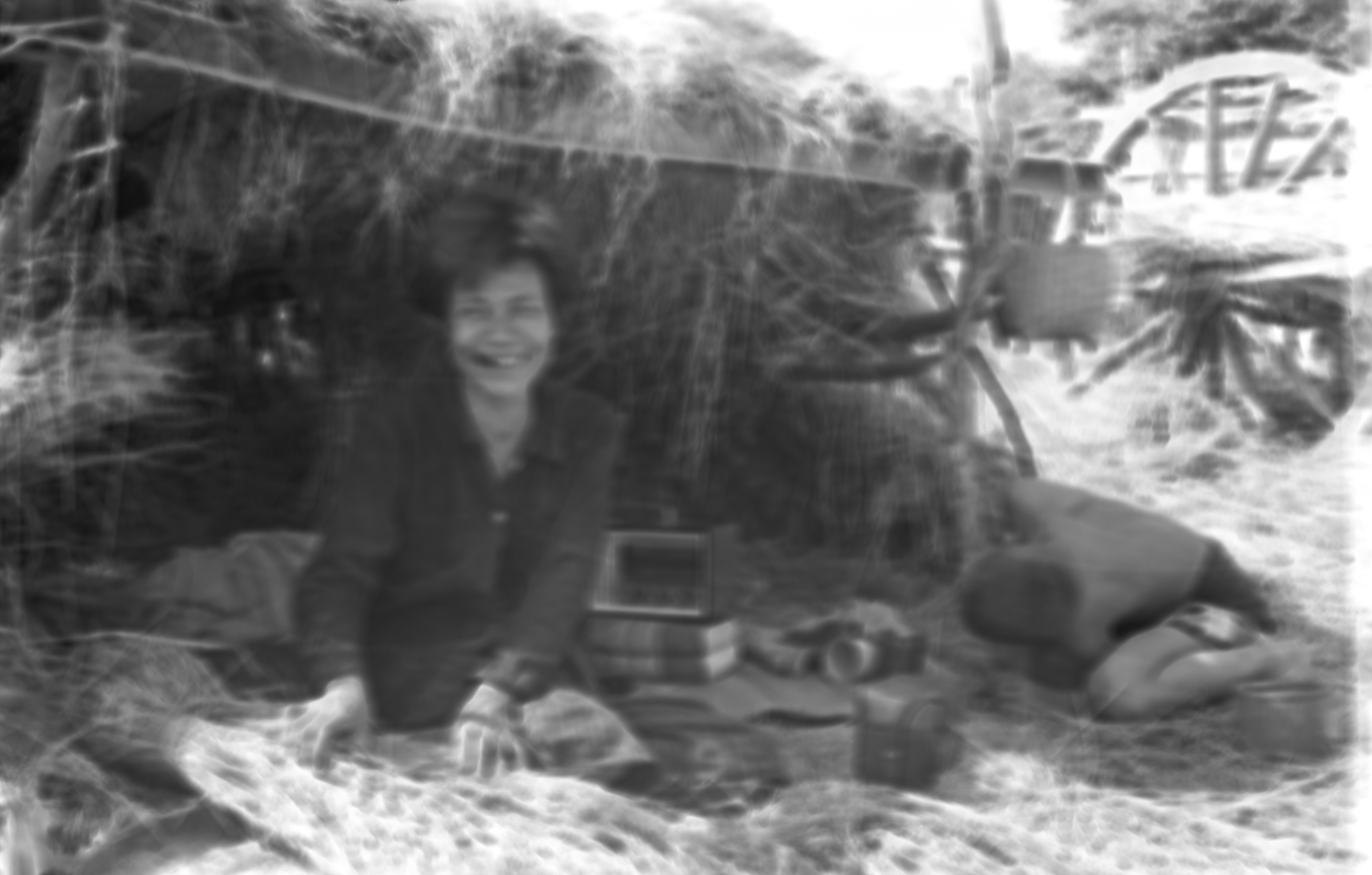 Woman in a field house with a radio and child, Changwat Maha Sarakham, Thailand, January 1964