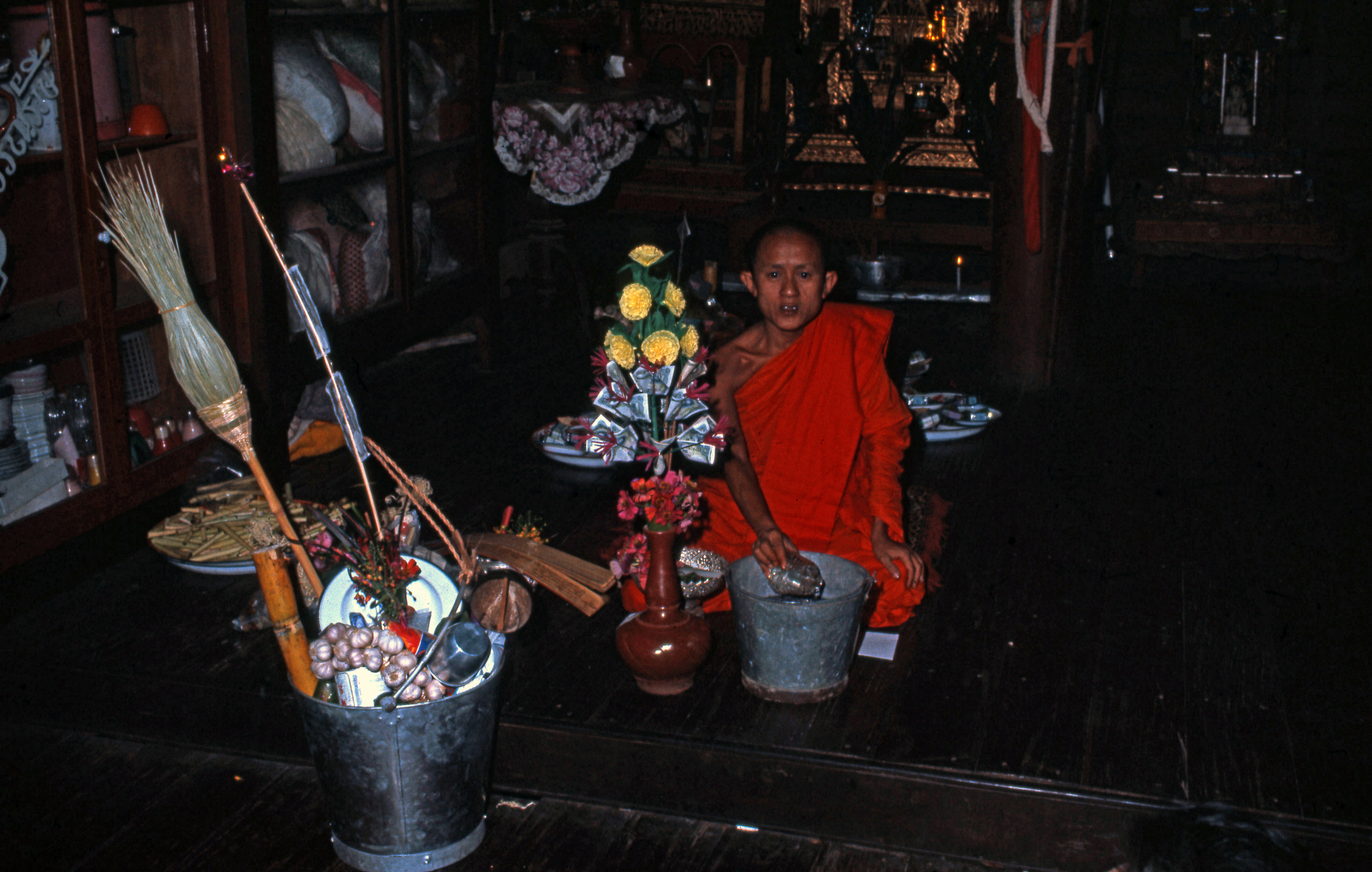 Kin Kuai Salāk (rite of distributing alms by lottery) at Wat Côm Thông – abbot pouring libation, Amphoe Mae Sariang, Changwat Mae Hong Son, Thailand, September 1968