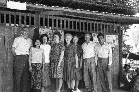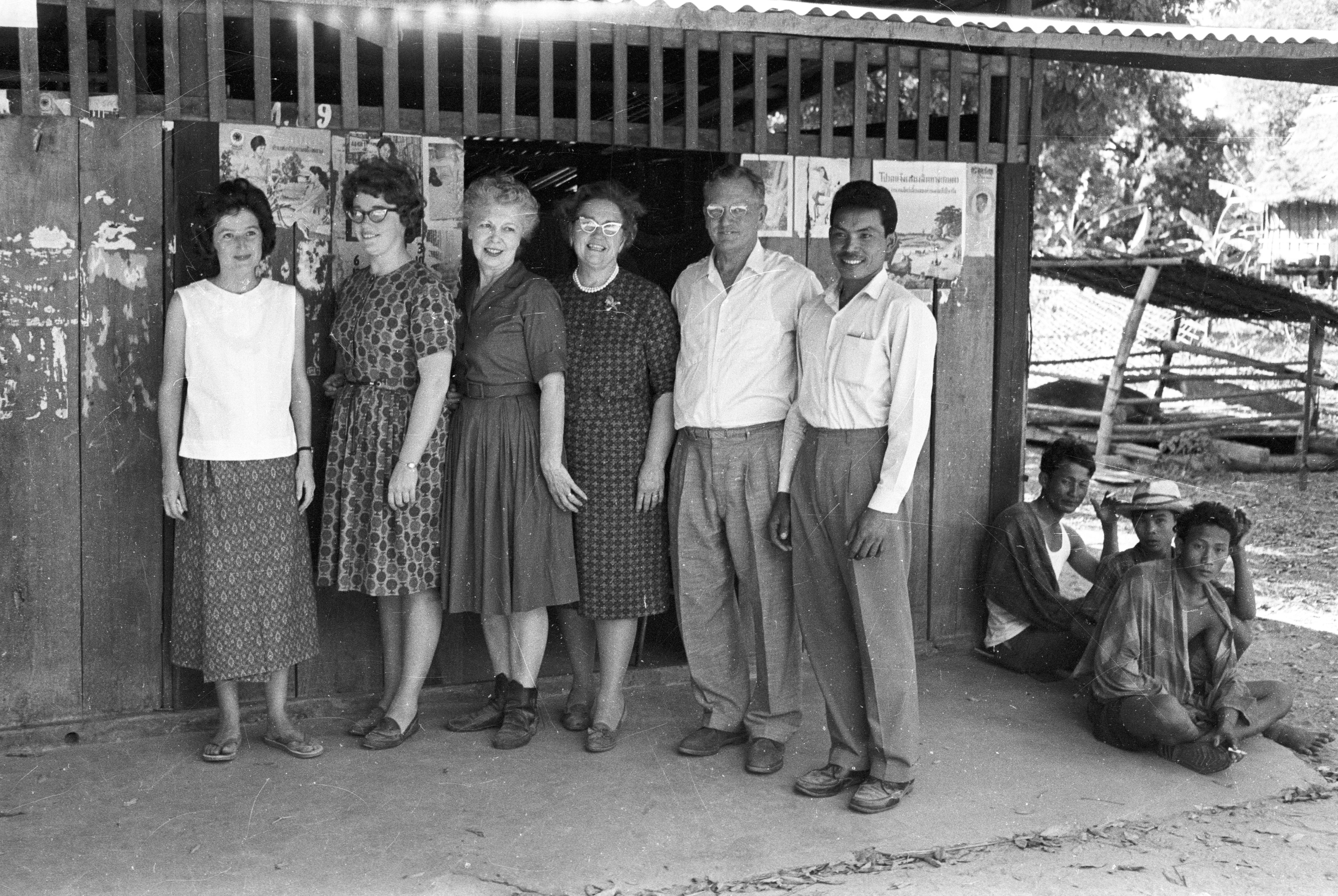 Family and villagers in front of our house, 3 photos, Ban Nong Tun, Amphoe Muang, Changwat Maha Sarakham, Thailand, December 1963