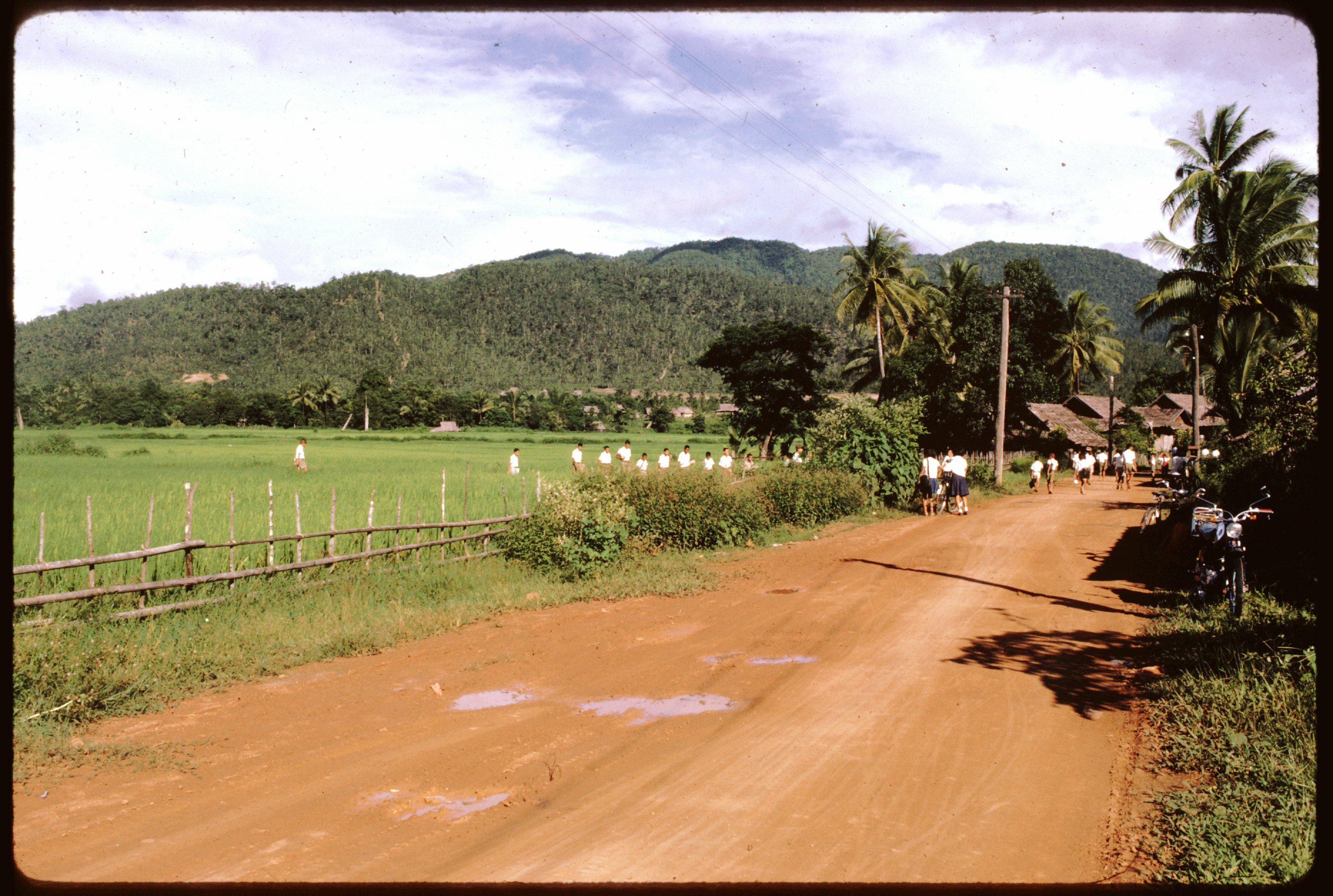 View of mountains and rice fields from Mae Sariang road – children crossing fields, 2 photos, Amphoe Mae Sariang, Changwat Mae Hong Son, Thailand, September 1967