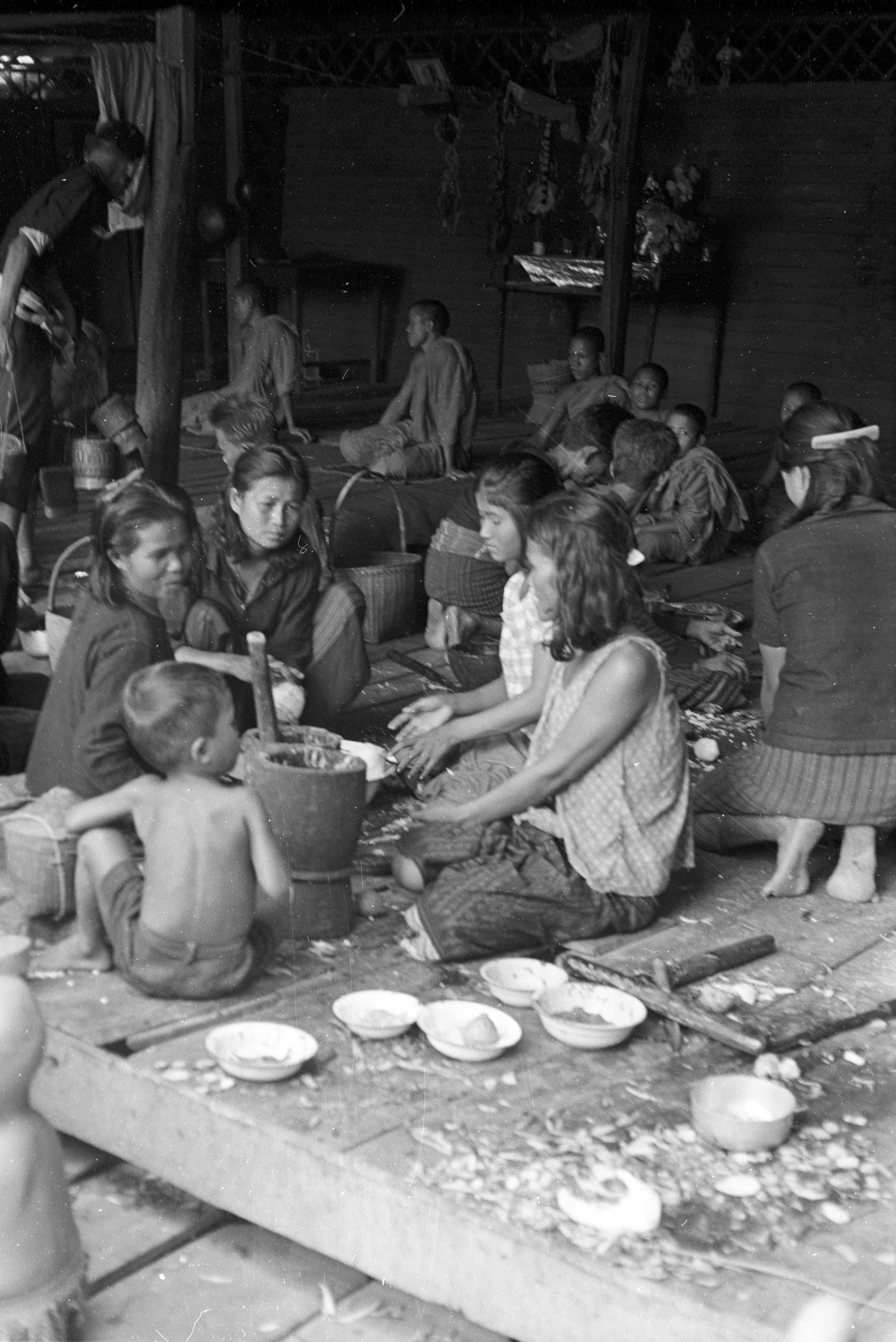 Women preparing food for a ritual feast, Ban Nong Tun, Amphoe Muang, Changwat Maha Sarakham, Thailand, September 1963