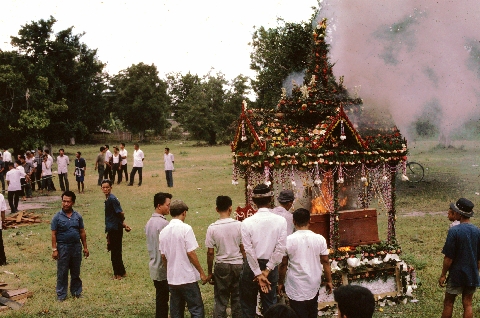 Funeral of old woman -- burning of the pyre, corpse burning on pyre, 2 photos, Changwat Chiang Mai, Thailand, August 1967
