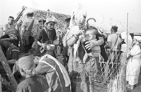 S'gaw Karen village: Women pouring water on new crown for stupa, Ban Mae Top Nuea, Amphoe Mae Sariang, Changwat Mae Hong Son, Thailand, March 1968