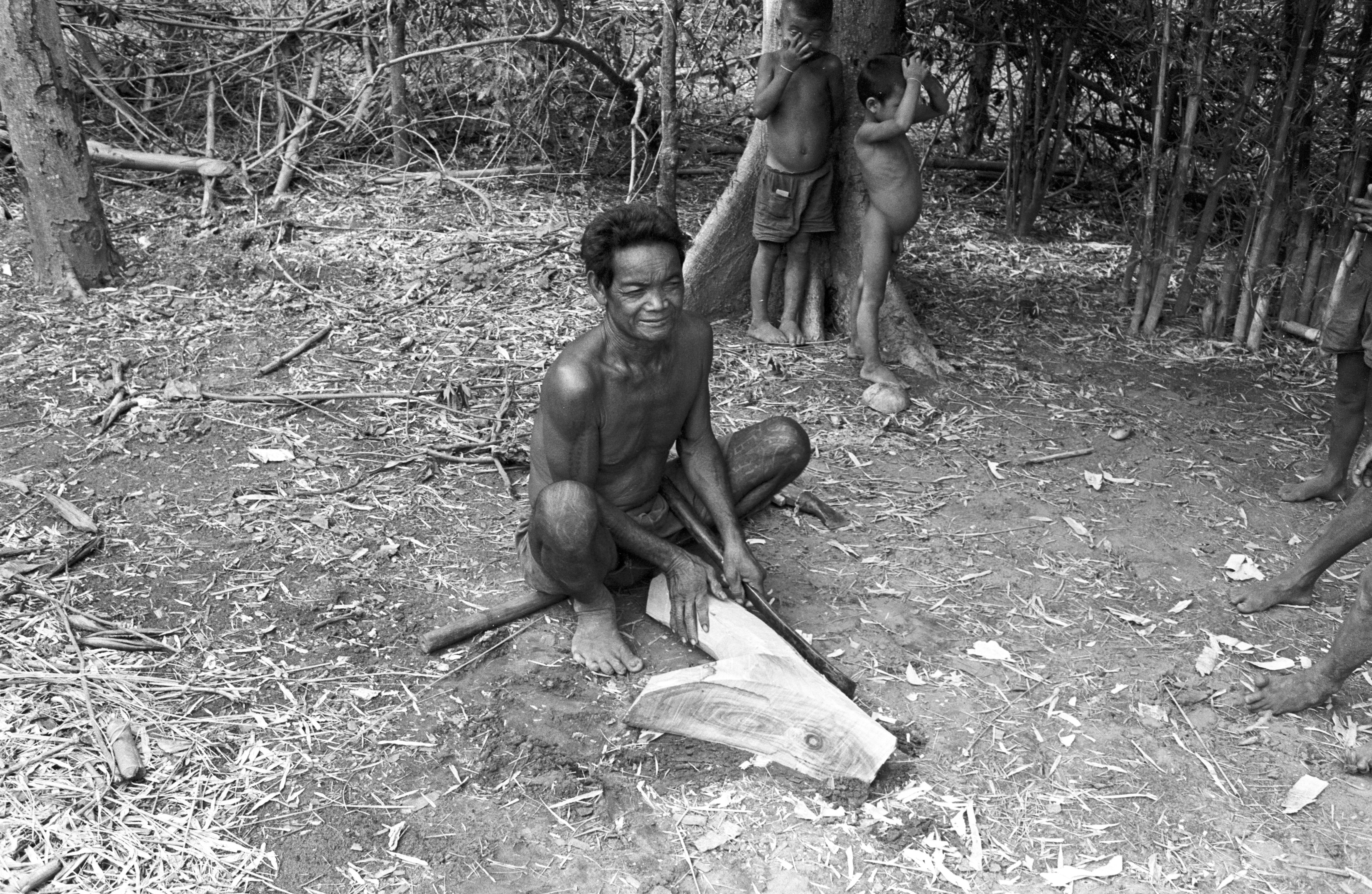 Man making base of plow; note tattoos on legs, Ban Nong Tun, Amphoe Muang Maha Sarakham, Changwat Maha Sarakham, Thailand, May 1968