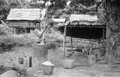 Young village man stirring the pig feed at the back of the house, Ban Nong Tun, Amphoe Muang, Changwat Maha Sarakham, Thailand, September 1963