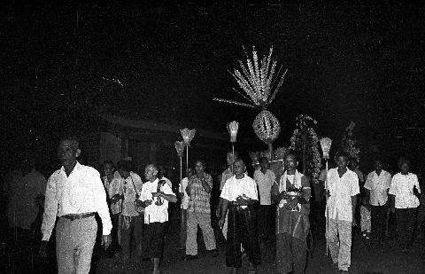 Thôt phāpā (offering of robes and gifts to monks in a wat) sponsored by Phanasit Company: procession to Wat Mandalay, 3 photos, Mae Hong Son Province, Thailand, December 1967