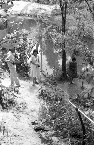 Tom Kirsch and Jane Keyes on edge of pond, Ban Nong Sung, Changwat Mukdahan, Thailand, November 1963