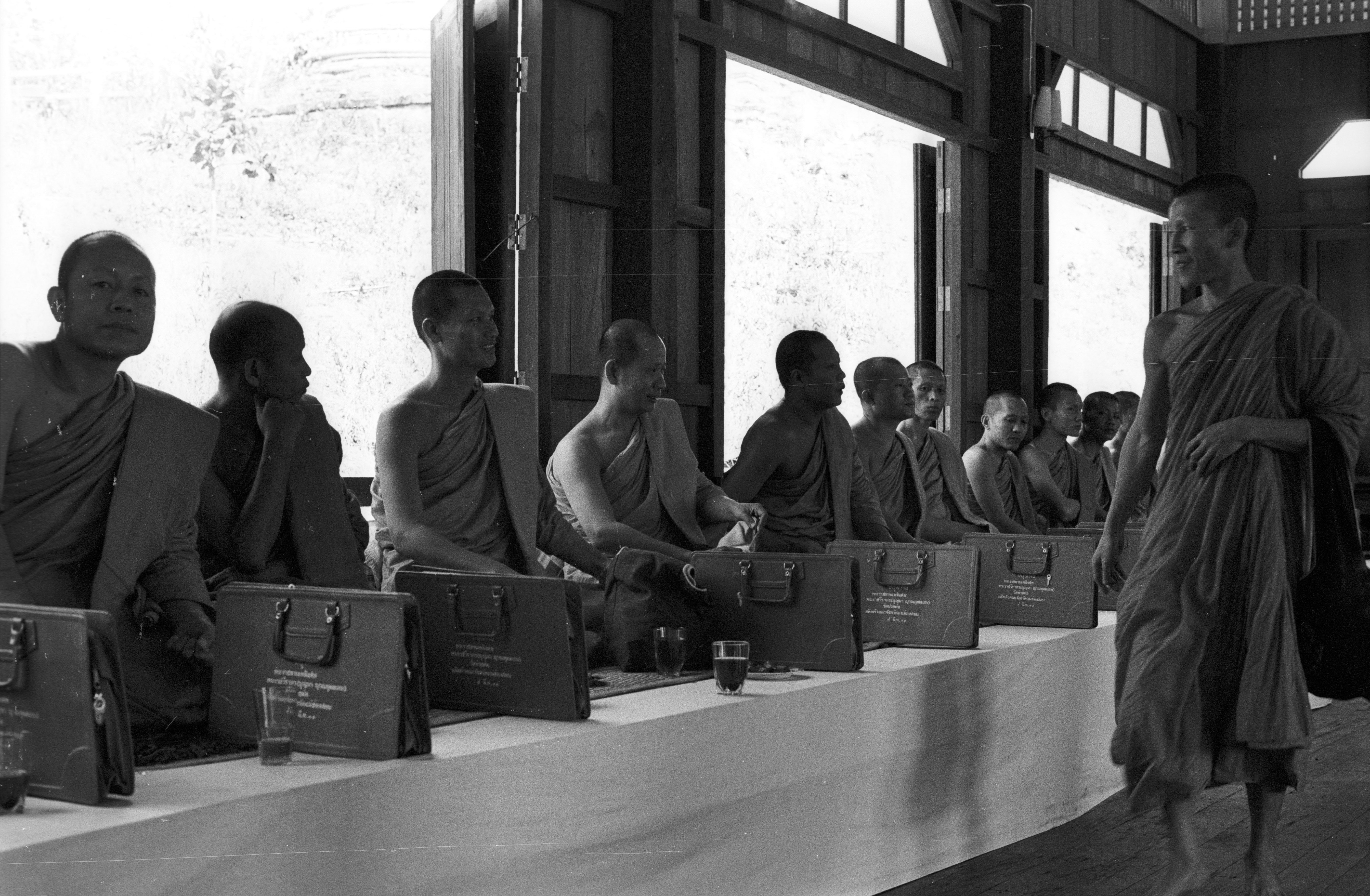 Monks at main wat in Mae Hong Son who have come for cremation of late provincial abbot, 6 photos, Amphoe Muang Mae Hong Son, Changwat Mae Hong Son, Thailand, March 1968