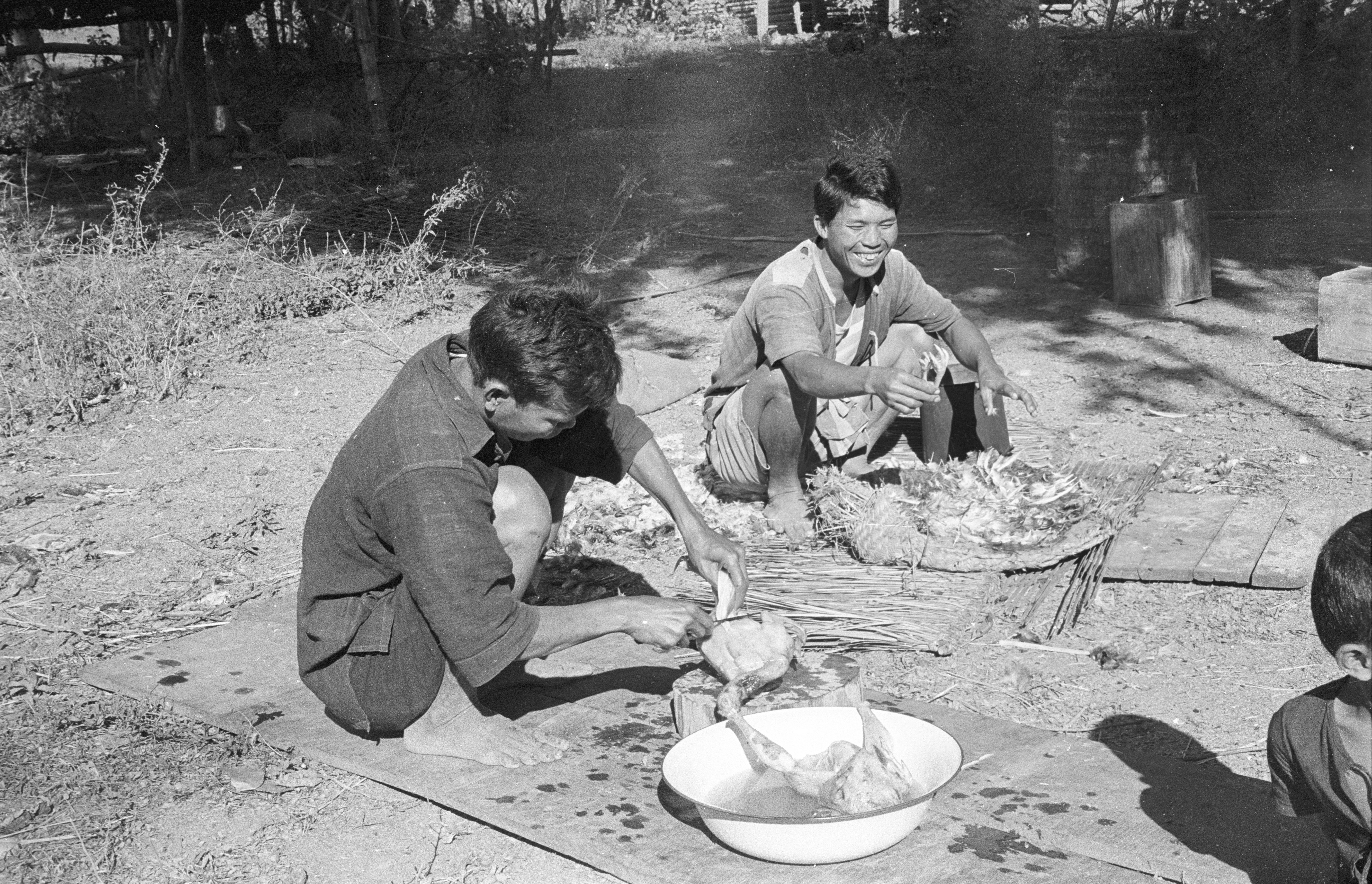 Village men preparing dish with chicken meat, Ban Nong Tun, Amphoe Muang, Changwat Maha Sarakham, Thailand, December 1963
