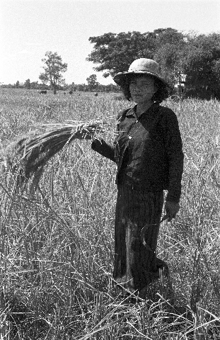 Woman holding harvested rice, Ban Nong Tun, Amphoe Muang, Changwat Maha Sarakham, Thailand, November 1963