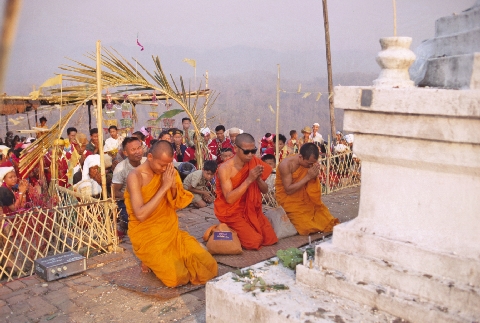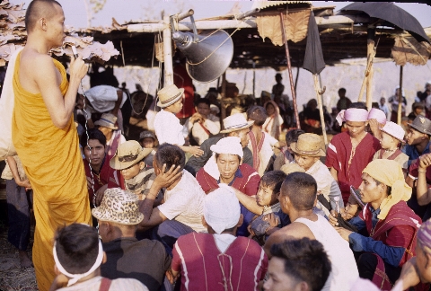 Dedication of new stupa (yôt Chēdī) – Cao Khana Amphoe addressing congregation, 1 photo; Cao Khana Amphoe and two other monks leading in ritual to dedicate stupa, 2 photos, Ban Mae Top Nuea, Thambon Ban Kat, Amphoe Mae Sariang, Changwat Mae Hong Son, Thailand, March 1968