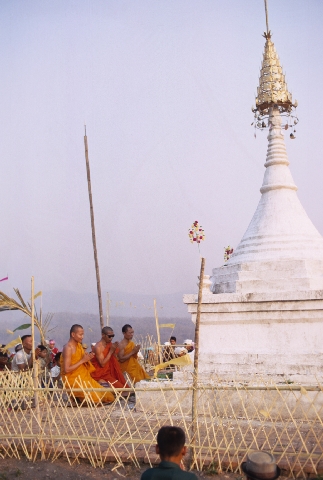 Dedication of new stupa (yôt Chēdī) – Cao Khana Amphoe addressing congregation, 1 photo; Cao Khana Amphoe and two other monks leading in ritual to dedicate stupa, 2 photos, Ban Mae Top Nuea, Thambon Ban Kat, Amphoe Mae Sariang, Changwat Mae Hong Son, Thailand, March 1968