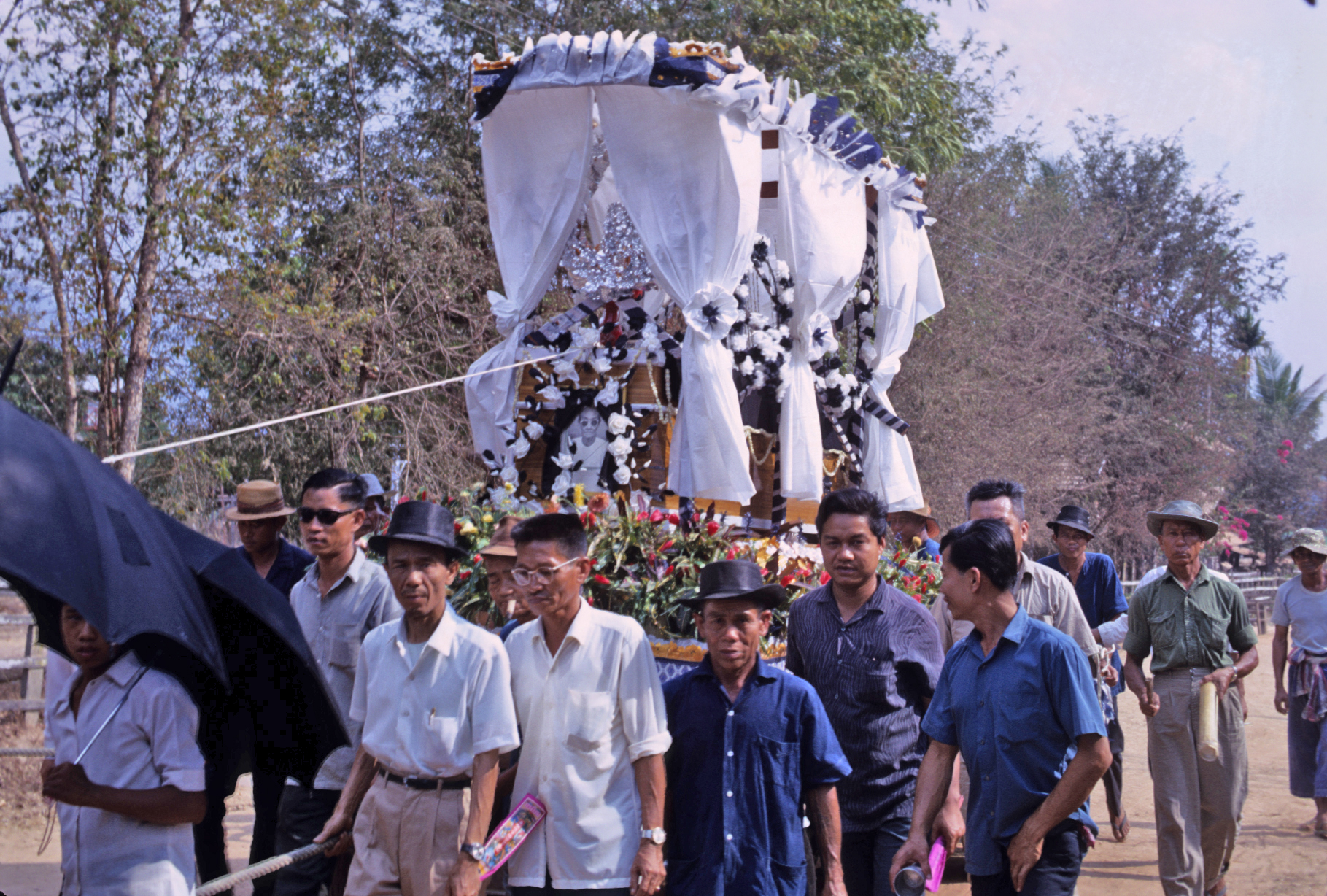 Funeral procession passing our house, 3 photos, Amphoe Mae Sariang, Changwat Mae Hong Son, Thailand, March 1968