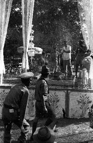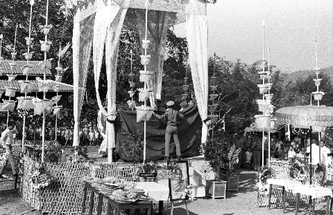 Cremation of late provincial abbot of Mae Hong Son: removing casket, 4 photos, Amphoe Muang Mae Hong Son, Changwat Mae Hong Son, Thailand, March 1968