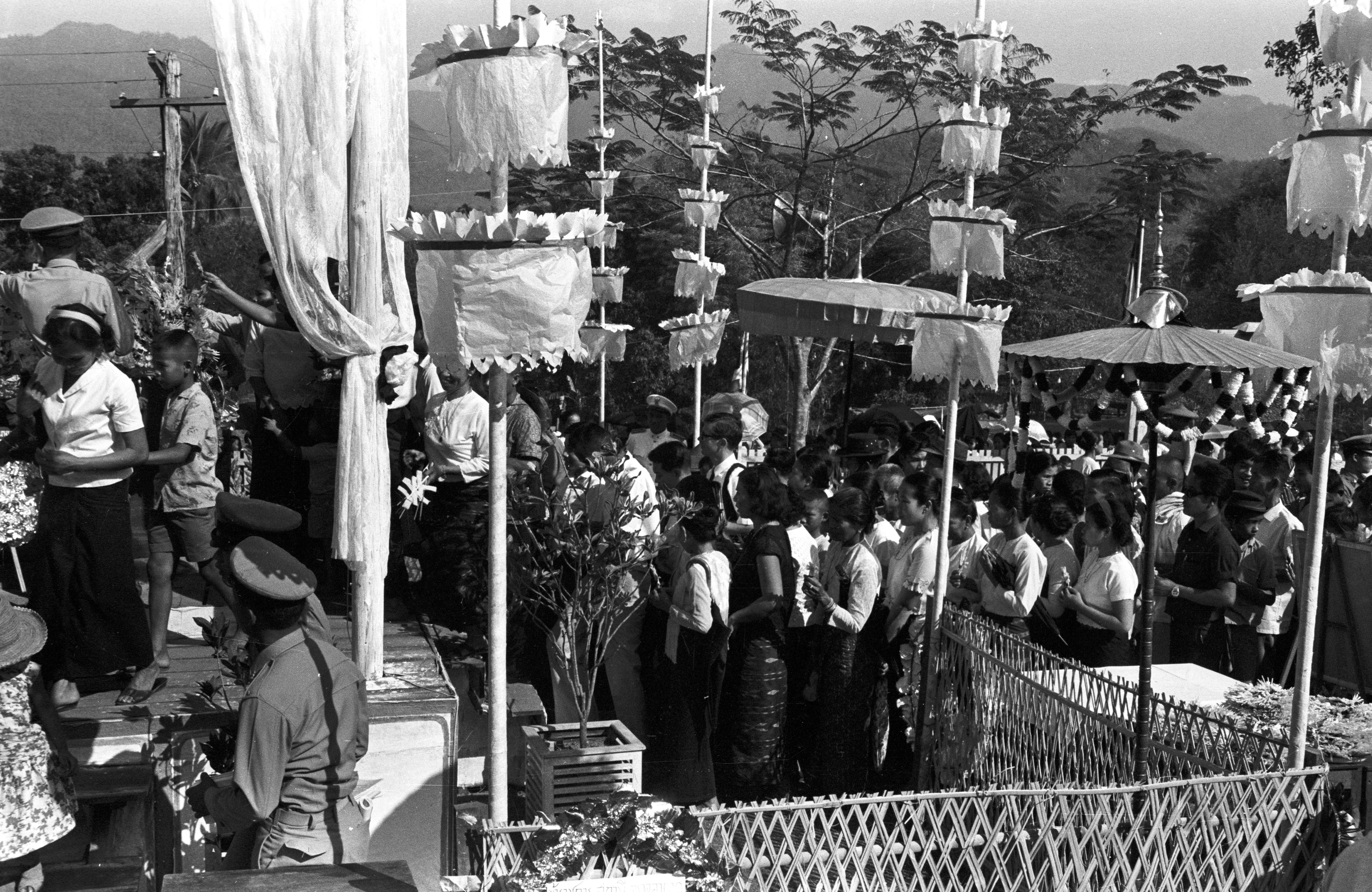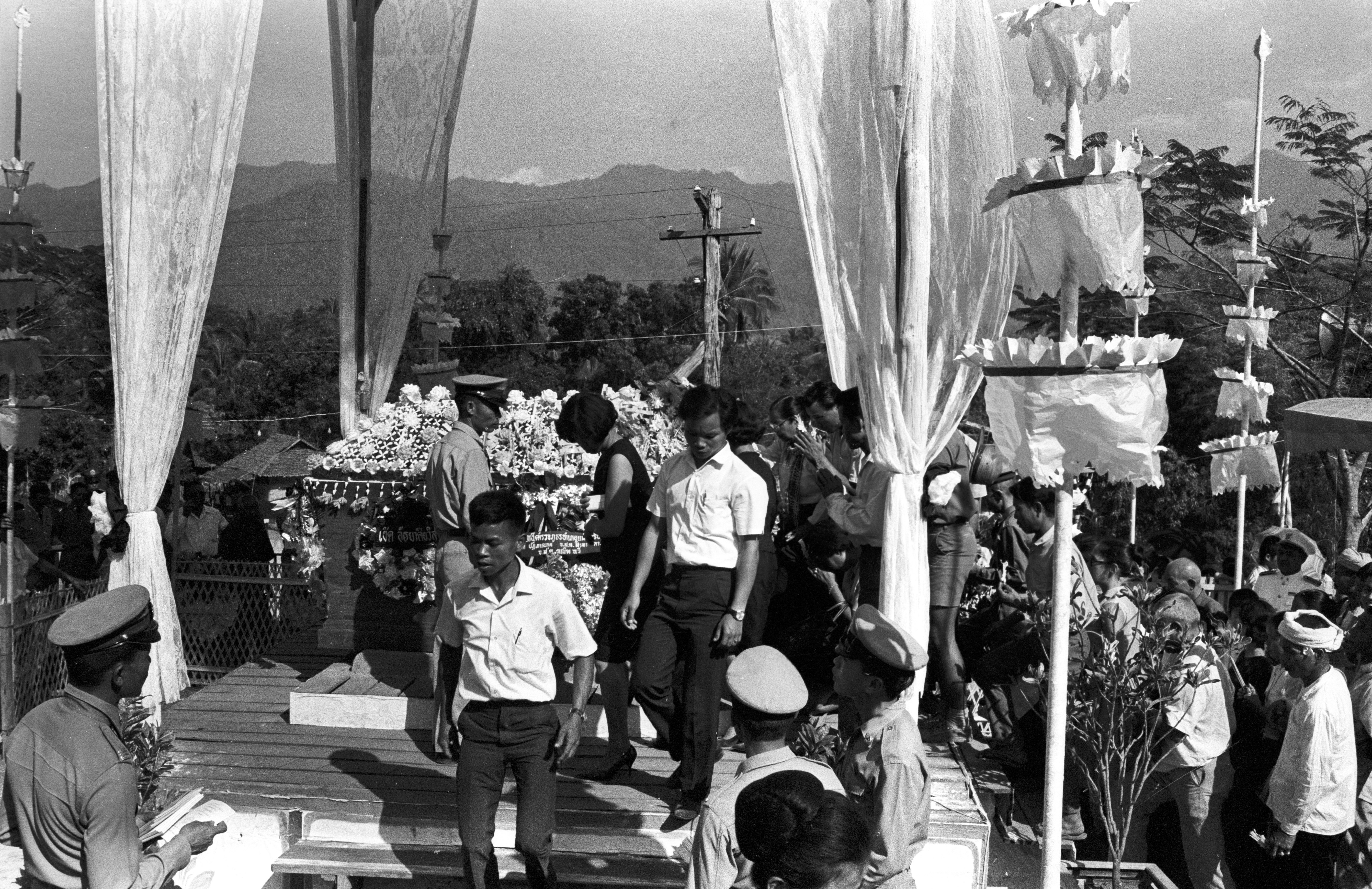 Cremation of late provincial abbot of Mae Hong Son: people paying their respects to the casket, 16 photos, Amphoe Muang Mae Hong Son, Changwat Mae Hong Son, Thailand, March 1968