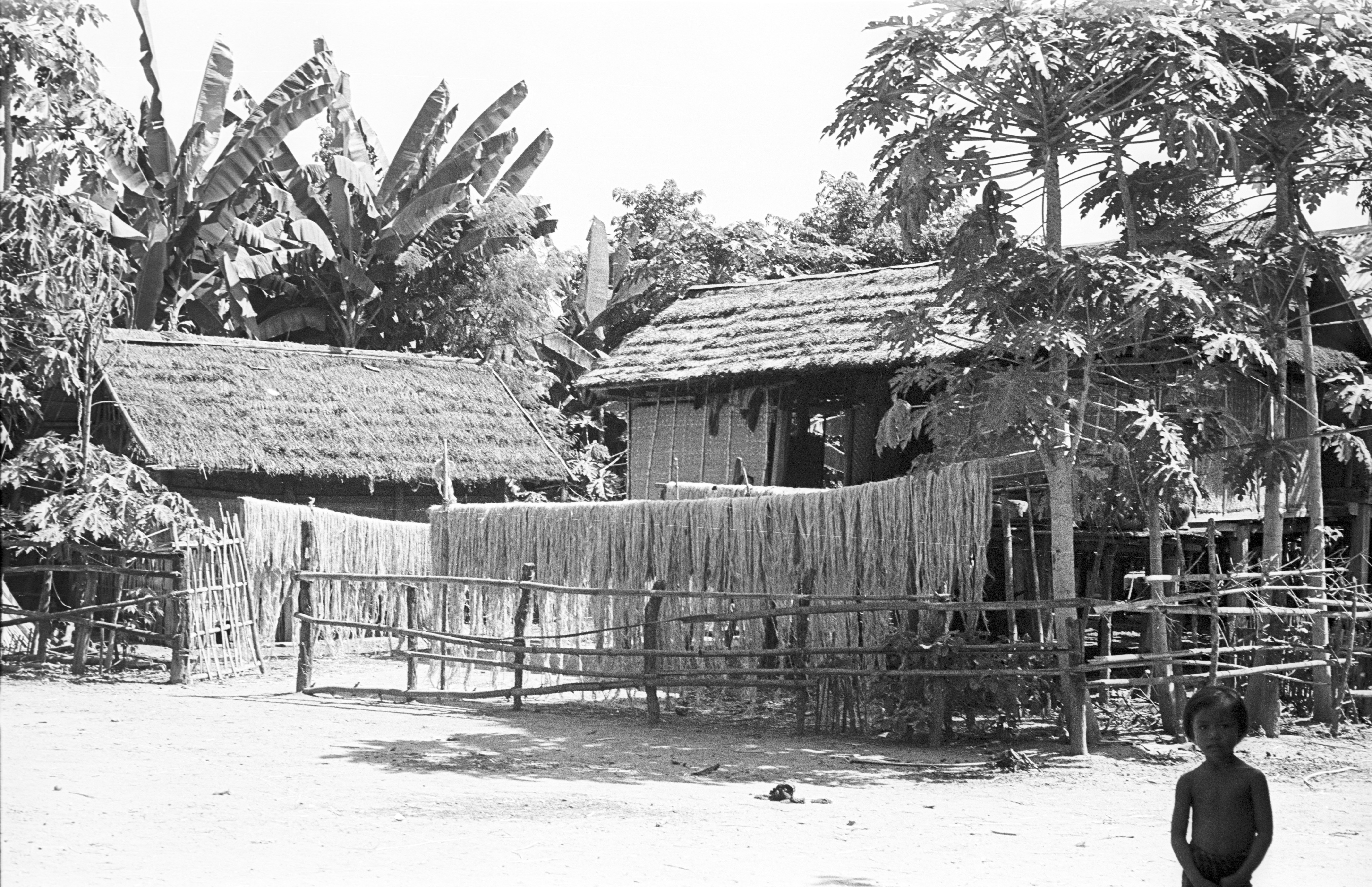 Village house with kenaf drying in front, Ban Nong Kha, Amphoe Muang, Changwat Maha Sarakham, Thailand, October 1963
