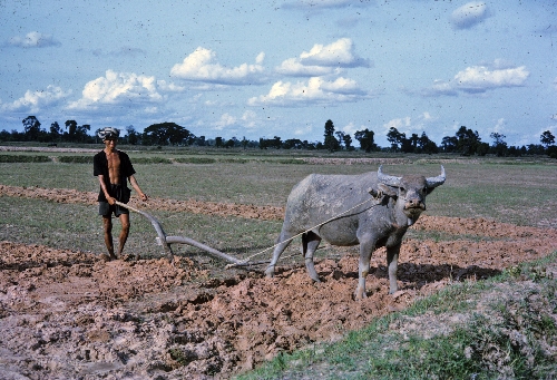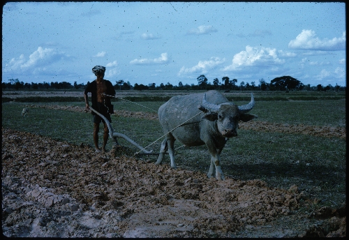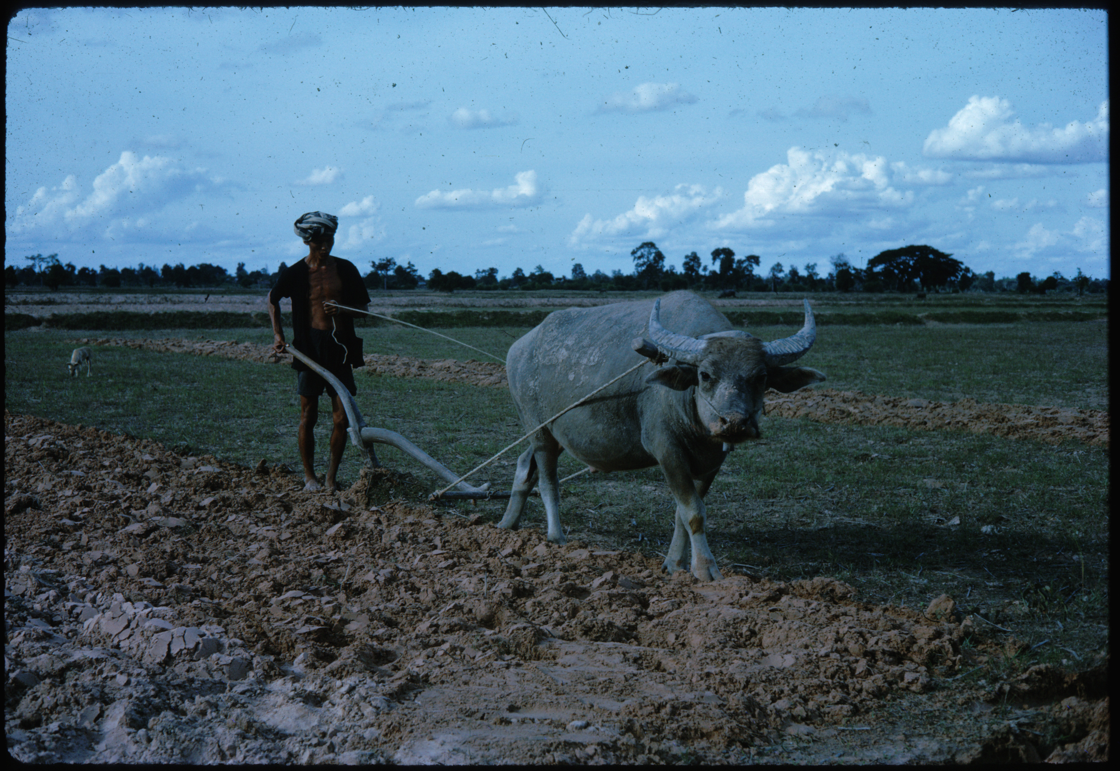 Plowing fields with a water buffalo, 3 photos, rural Northeastern Thailand, Ban Nong Tun, A. Muang, Changwat Maha Sarakham, 1963 or 1964
