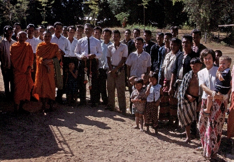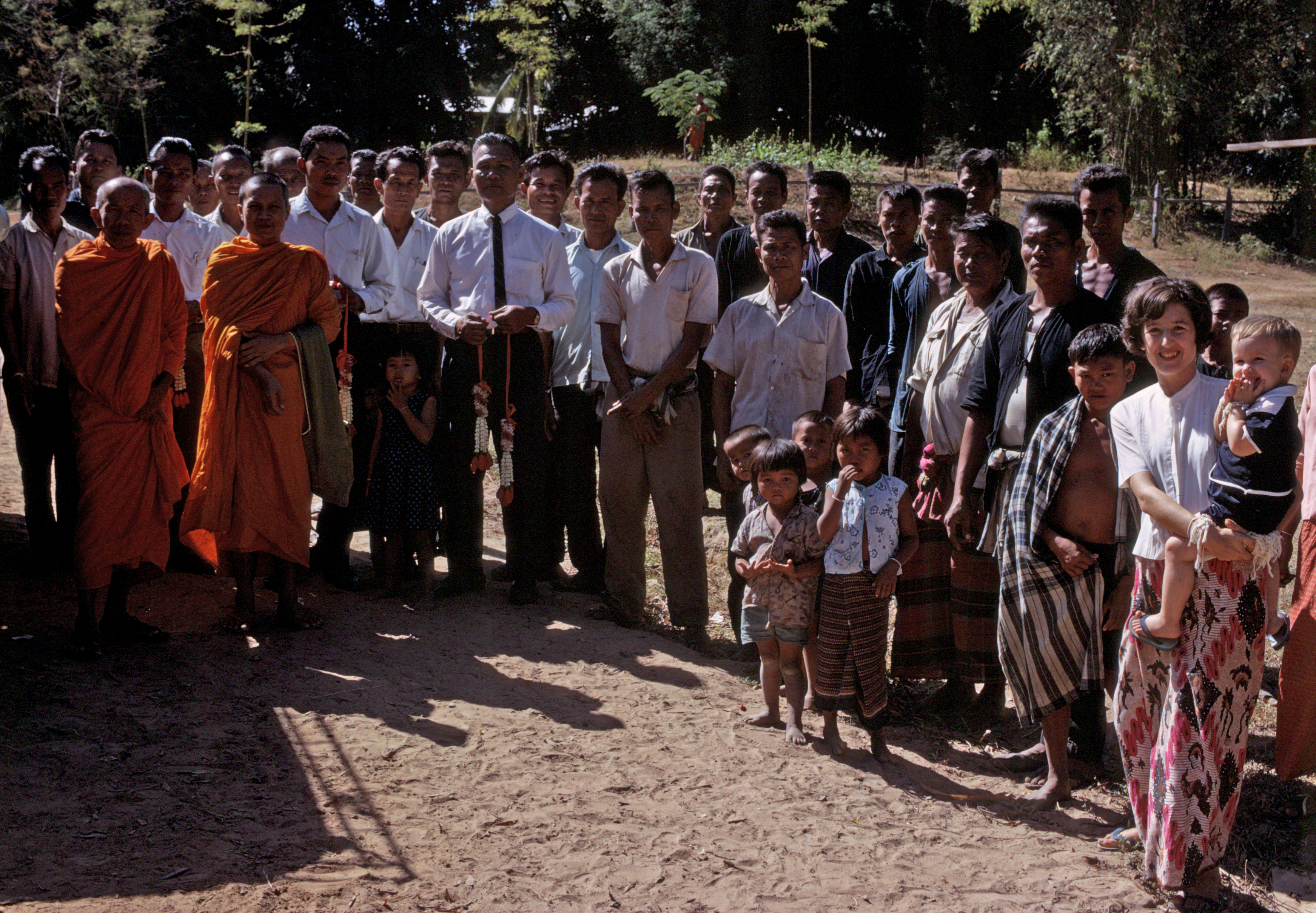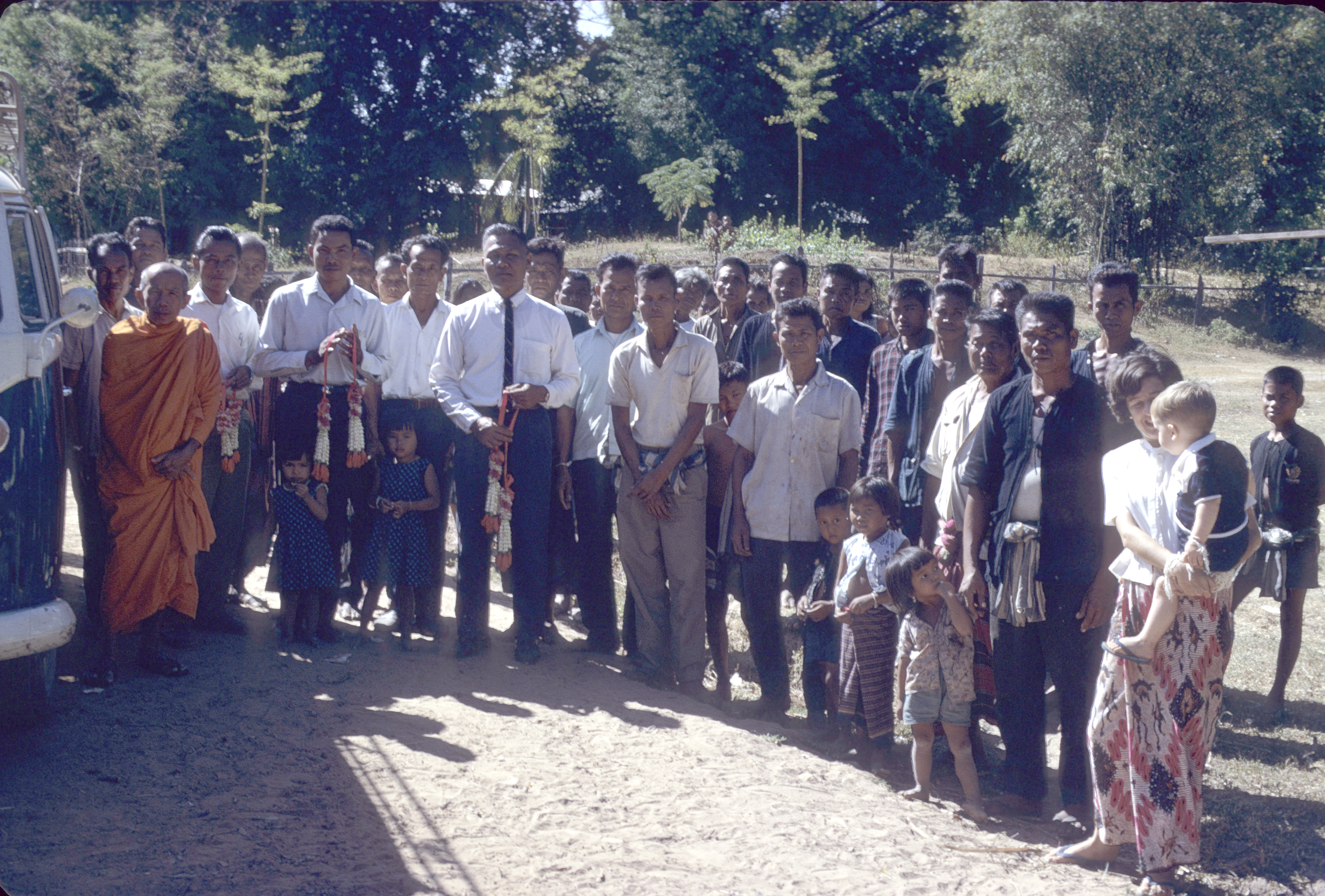 Villagers including Ngao and Phra Khrū Choei, Kamnan, Khrū Bunthiang, Jane and Nick Keyes at car just before departure from saying goodbye to village, 2 photos, Ban Nong Tun, Amphoe Muang Maha Sarakham, Changwat Maha Sarakham, Thailand, November 1968