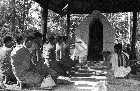 Bathing 'handprint of Buddha' (phraphutthahat, พระพุทธหัสต์) near B. Thung Phrāo, South of Mae Sariang: monks and novices beginning rite, chanting, eating midday meal, 4 photos, Amphoe Mae Sariang, Changwat Mae Hong Son, Thailand, May 1968