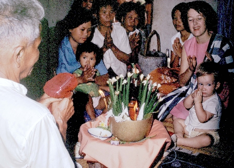 House-blessing Rite (L. เอาบุญเฮือน, ao bun hian) sponsored by leading village entrepreneur and his wife: Nick and Jane Keyes in front of baisi, Ban Nong Tun, Amphoe Muang Maha Sarakham, Changwat Maha Sarakham, Thailand, May 1968