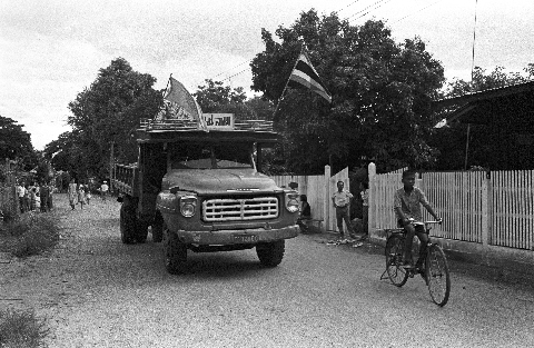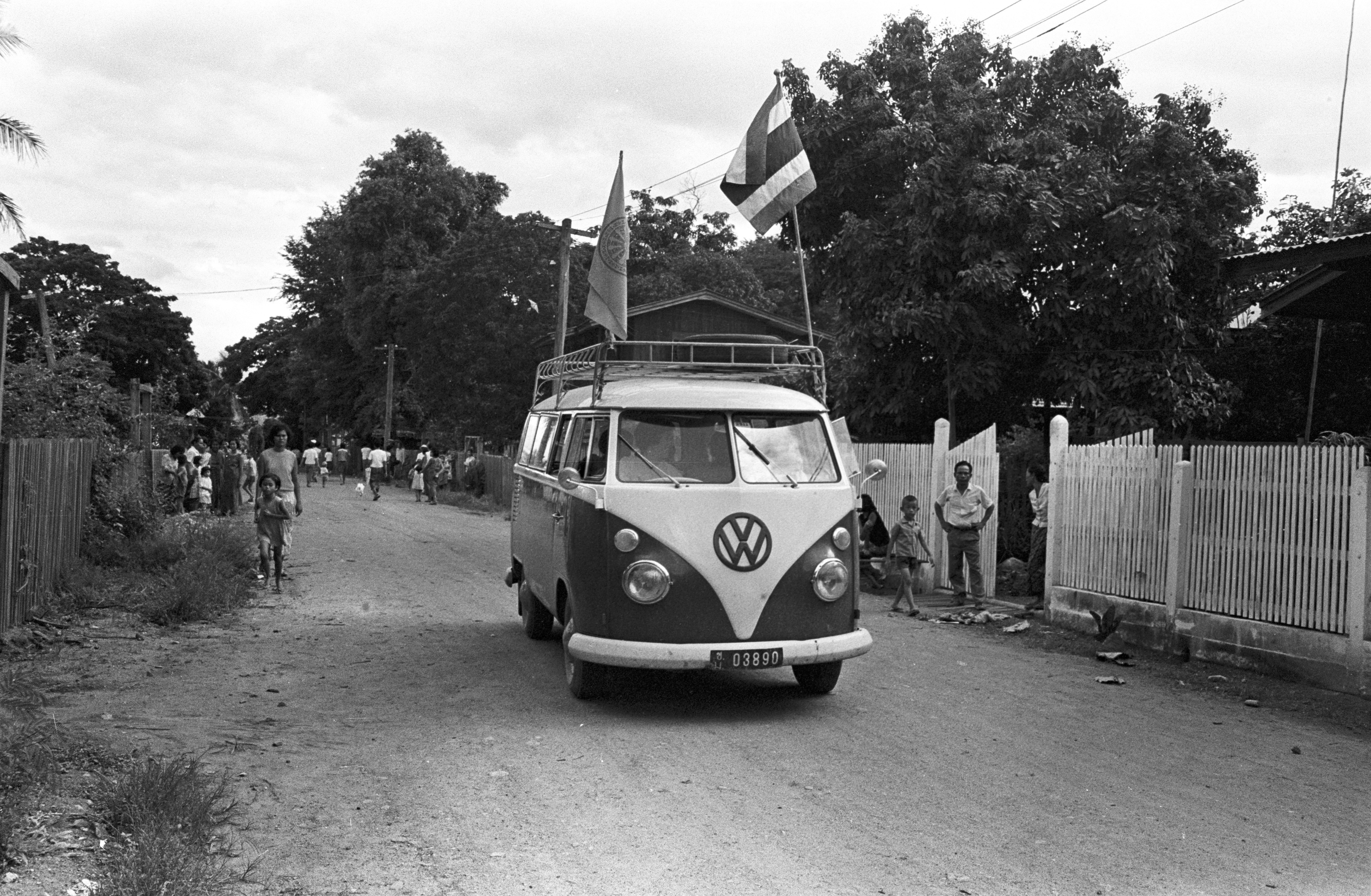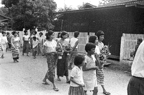 Wat Sitthimongkhon: thôt phāpā by Phanasit Company -- girls bringing offerings; truck bringing offering; our car in procession; 3 photos, Amphoe Mae Sariang, Changwat Mae Hong Son, Thailand, July 1968