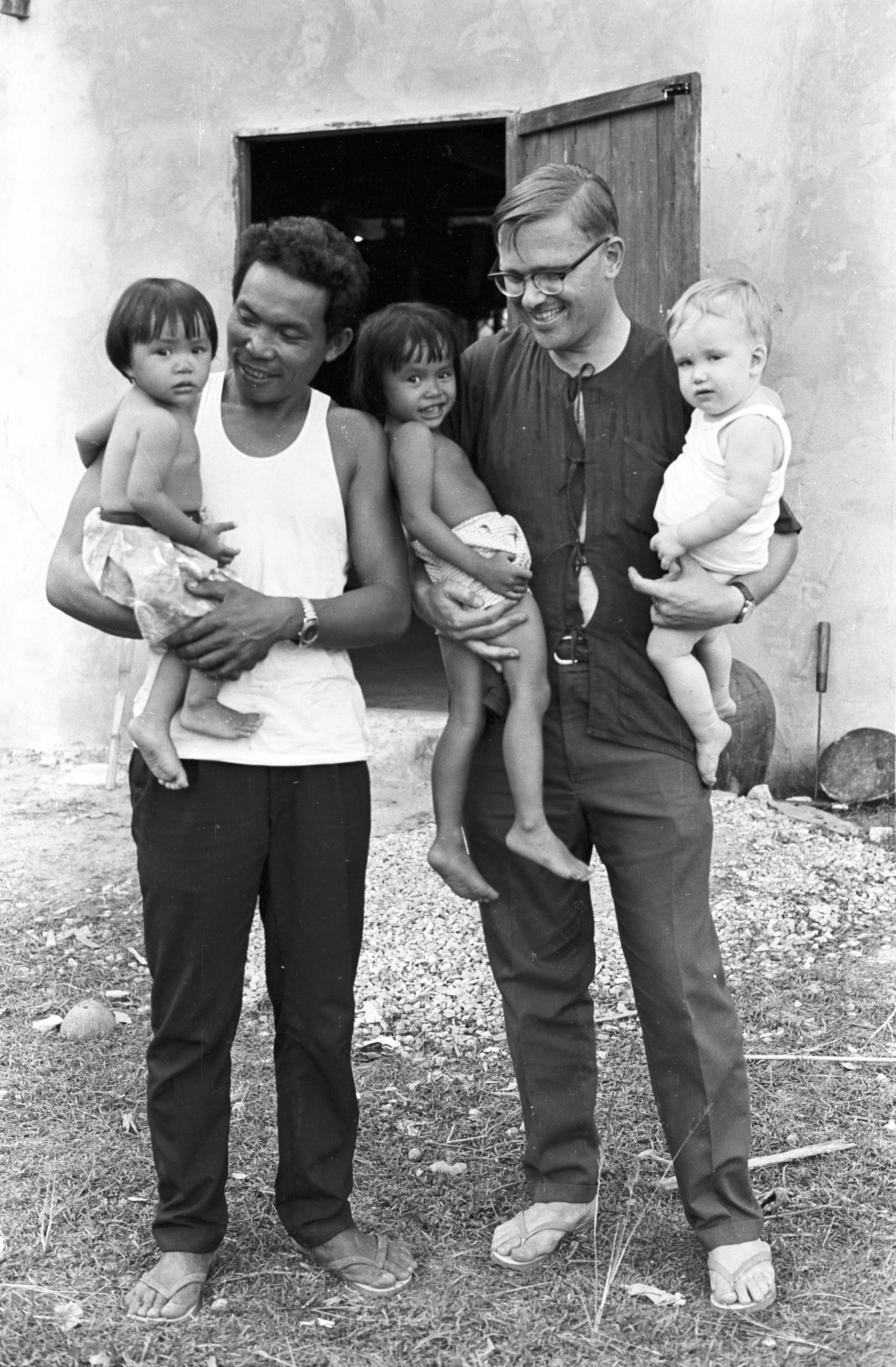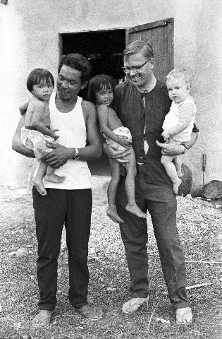 Ngao and Biff (Charles F.) Keyes holding up the three children, Maha Sarakham Province, Thailand, November 1967