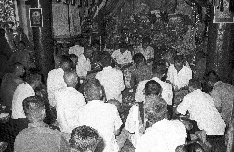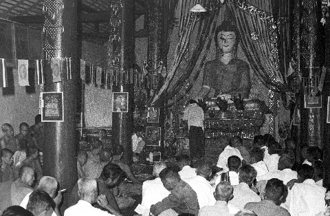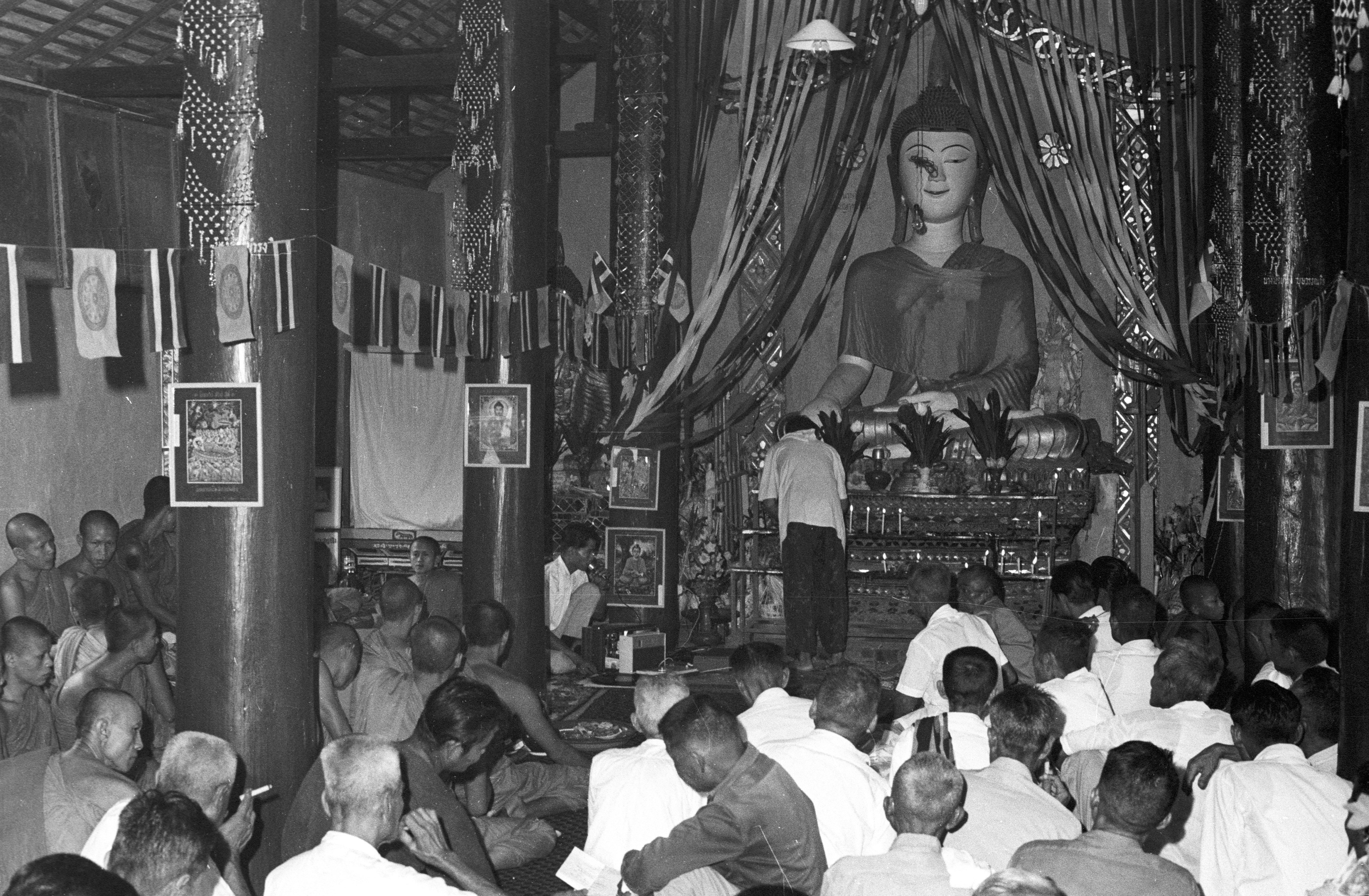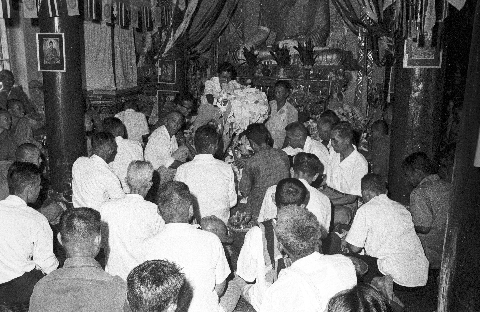 Wat Côm Cāēng: offering alms by lottery (kin kuai salāk ก๋ินก๋วยสลาก): ritual inside wat, 3 photos, Amphoe Mae Sariang, Changwat Mae Hong Son, Thailand, September 1968
