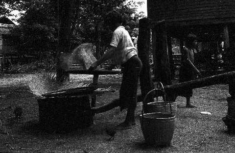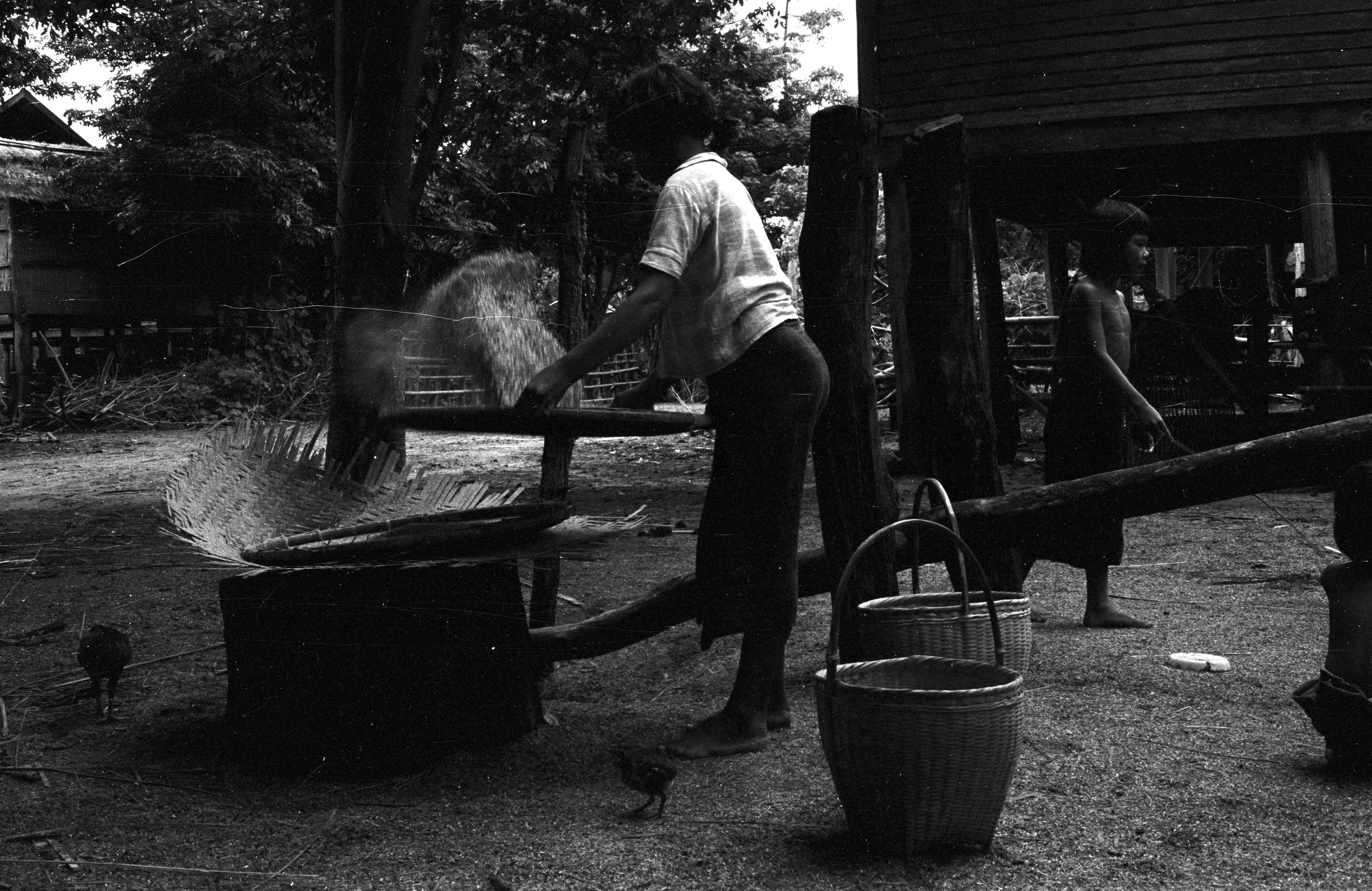 Woman sifting rice bran, Ban Nong Tun, Amphoe Muang, Changwat Maha Sarakham, Thailand, July 1963