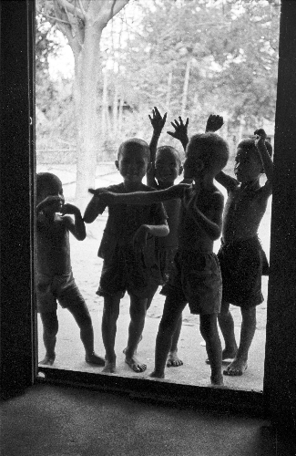 Children dancing in doorway, Changwat Maha Sarakham, Thailand, January 1964
