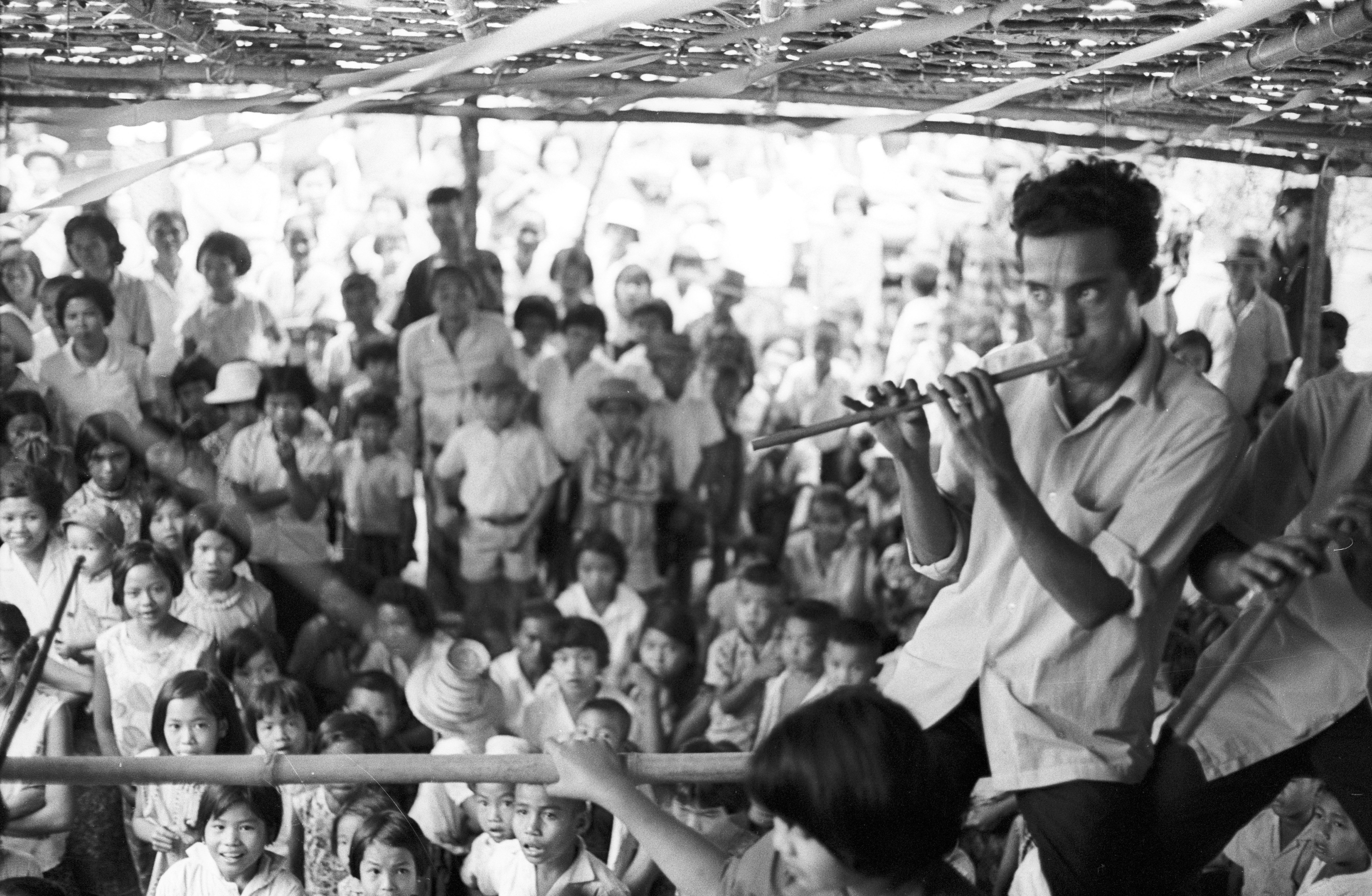 Party on the evening before ordination: guys clowning, 3 photos; musicians, 1 photo; audience watching performance, 3 photos, Ban Khapuang, Amphoe Mae Sariang, Changwat Mae Hong Son, Thailand, March 1968
