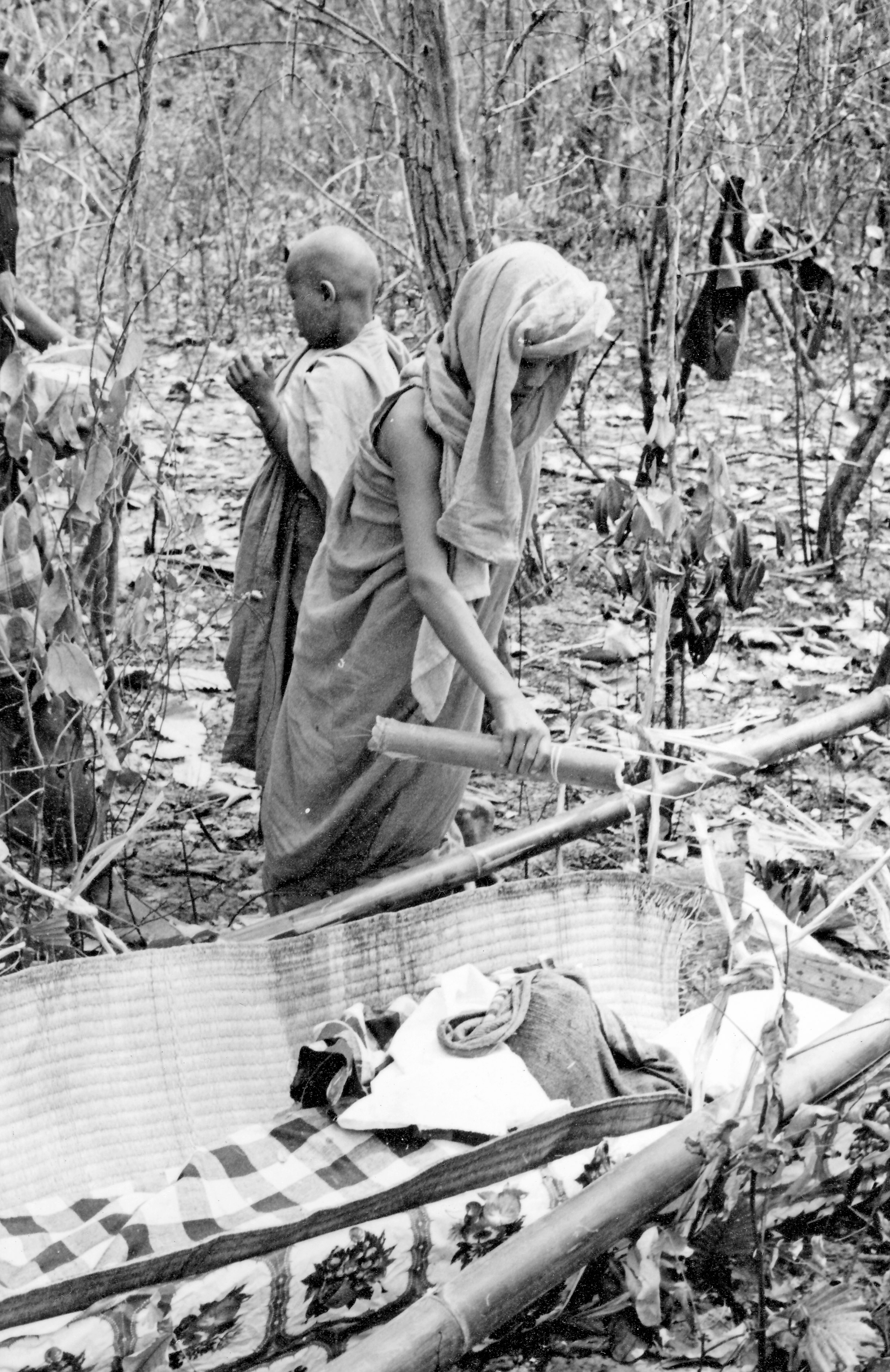 Novice pouring holy water rover the corpse of a village woman, photo 2, Changwat Maha Sarakham, Thailand, March 1964