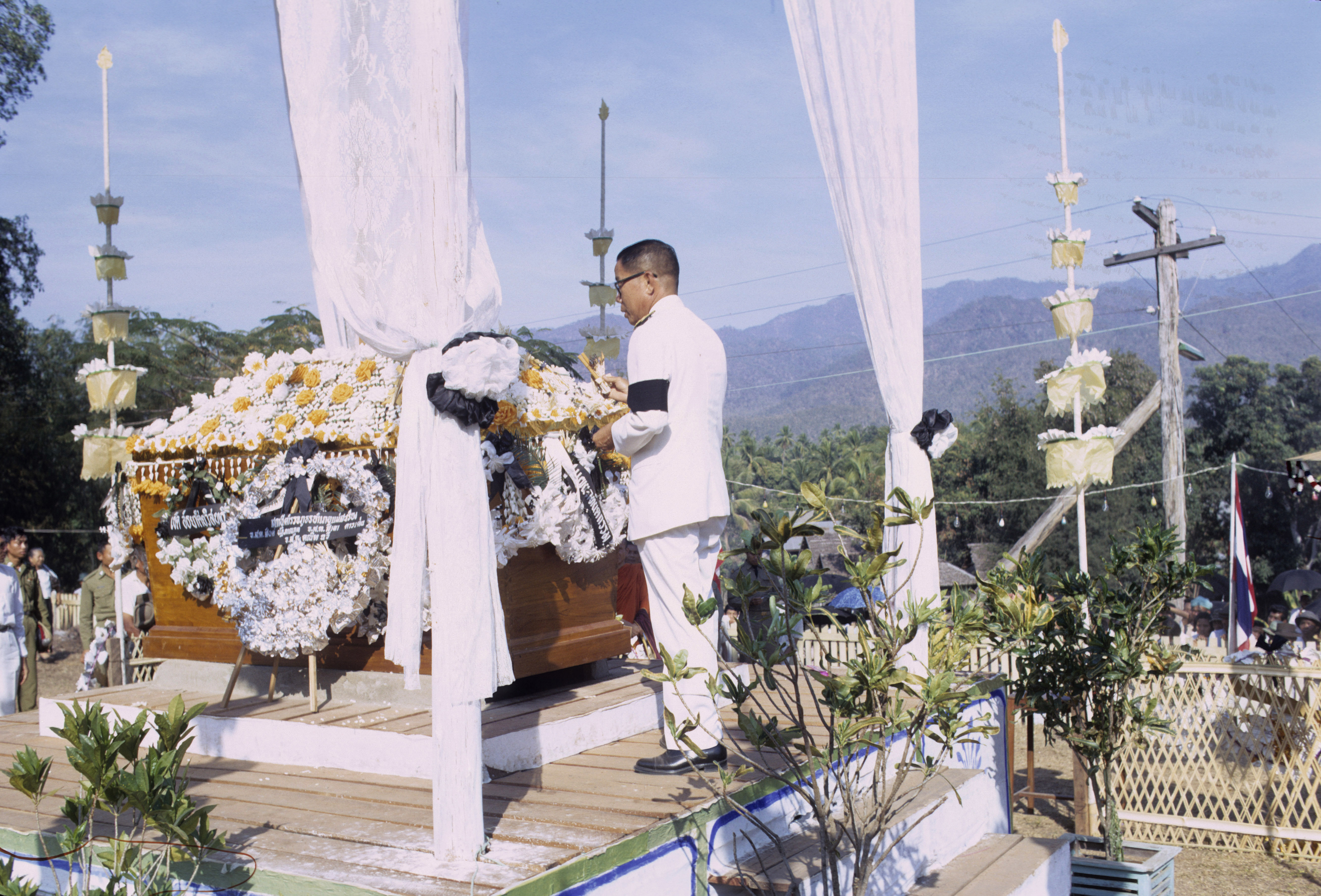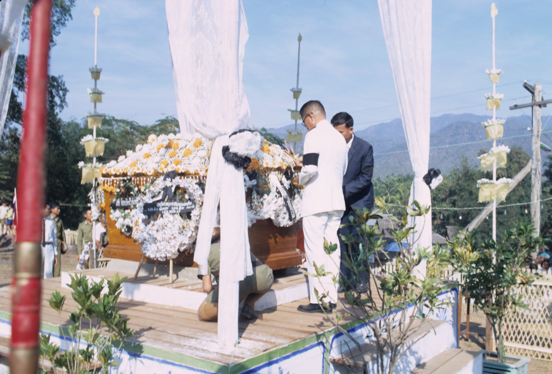 Funeral of late provincial abbot: governor preparing to light fire, 4 photos; others assisting in the burning, 3 photos, Mae Hong Son, Thailand, March 1968