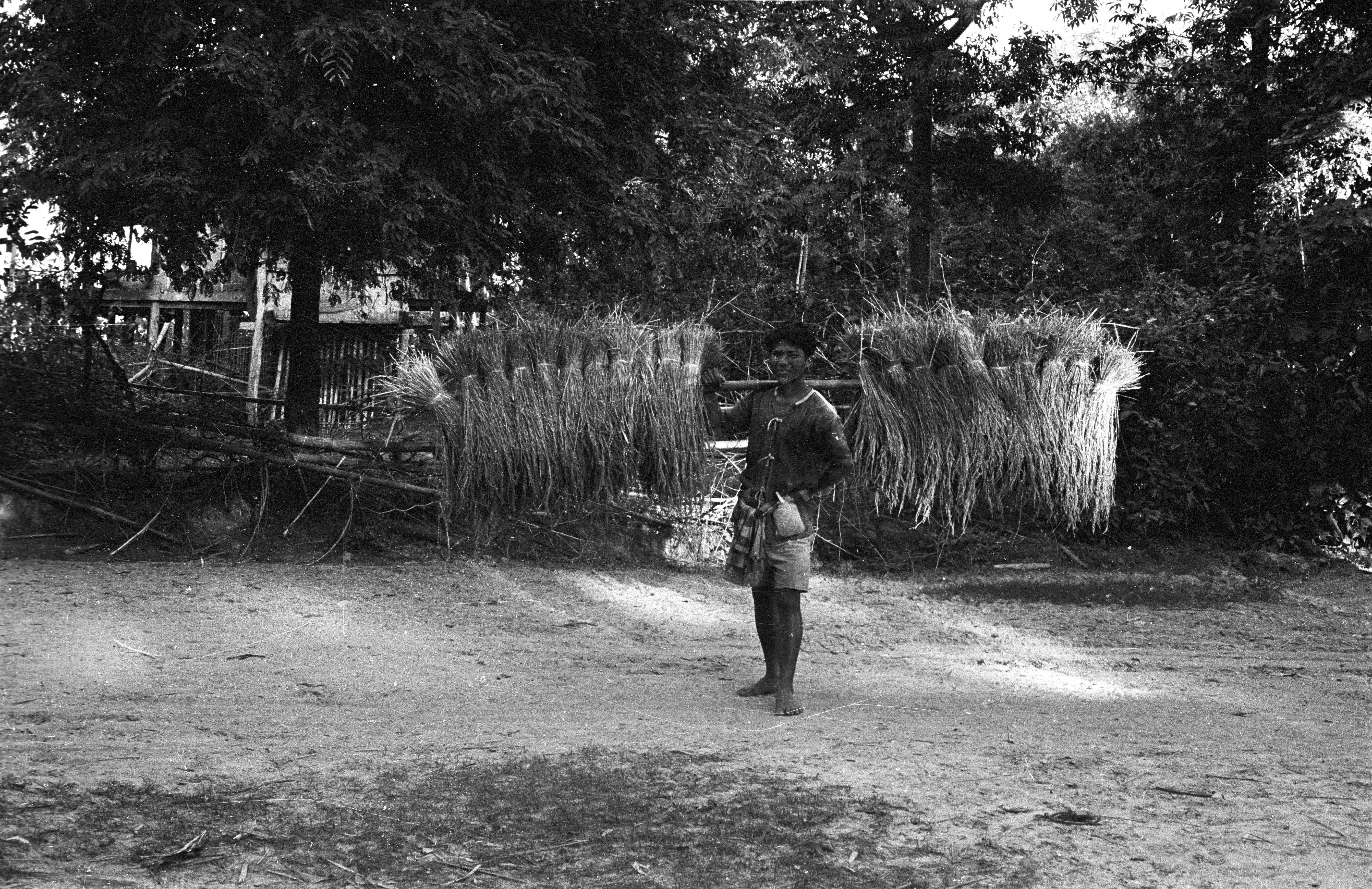 Village man carrying harvested rice, Ban Nong Tun, Amphoe Muang, Changwat Maha Sarakham, Thailand, November 1963