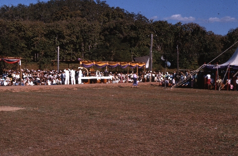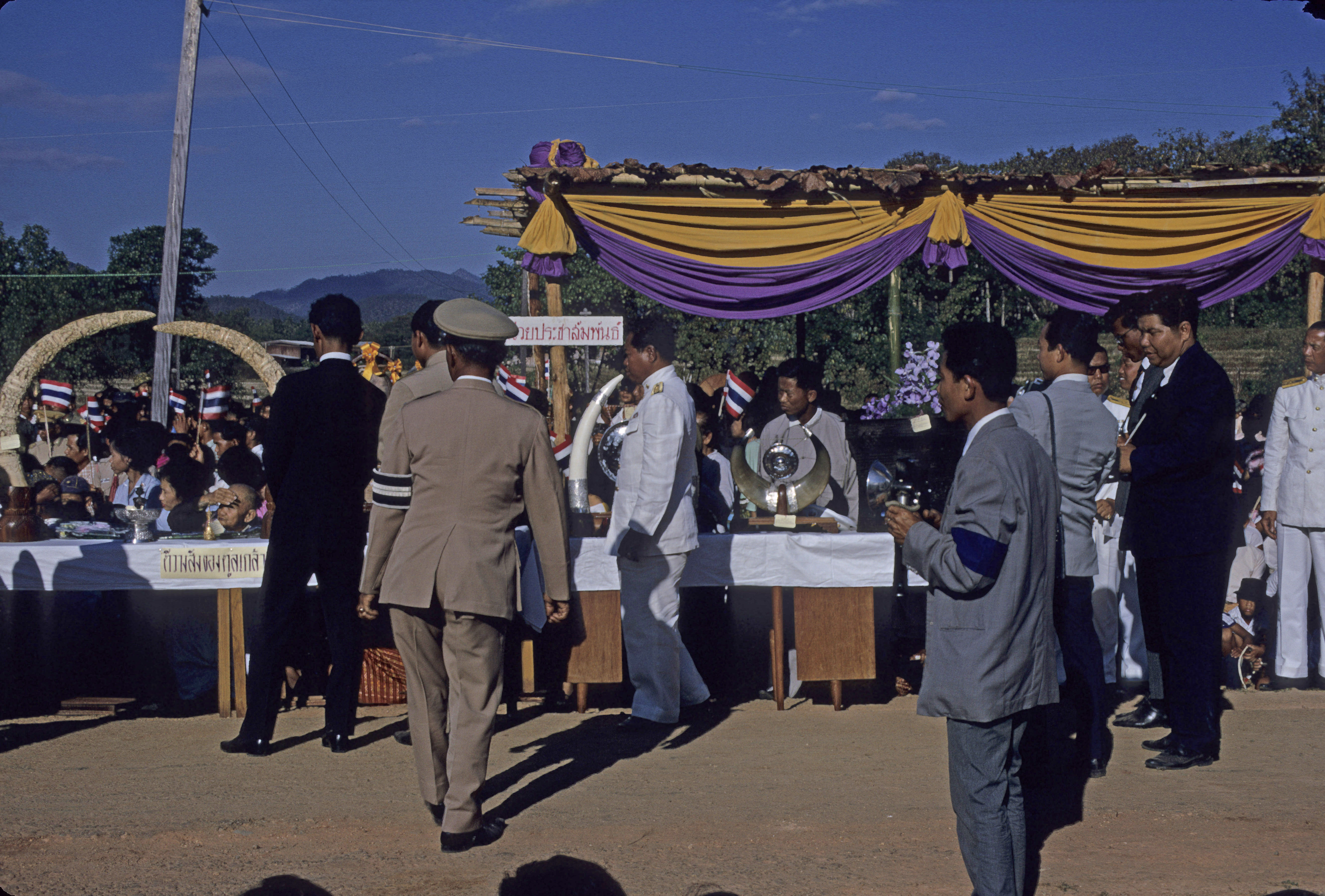 Ceremony at which King Bhumipol dedicated a royally-cast Buddha image as the palladium of the province – table with gifts for King, 2 photos, Amphoe Muang Mae Hong Son, Changwat Mae Hong Son, Thailand, January 1968