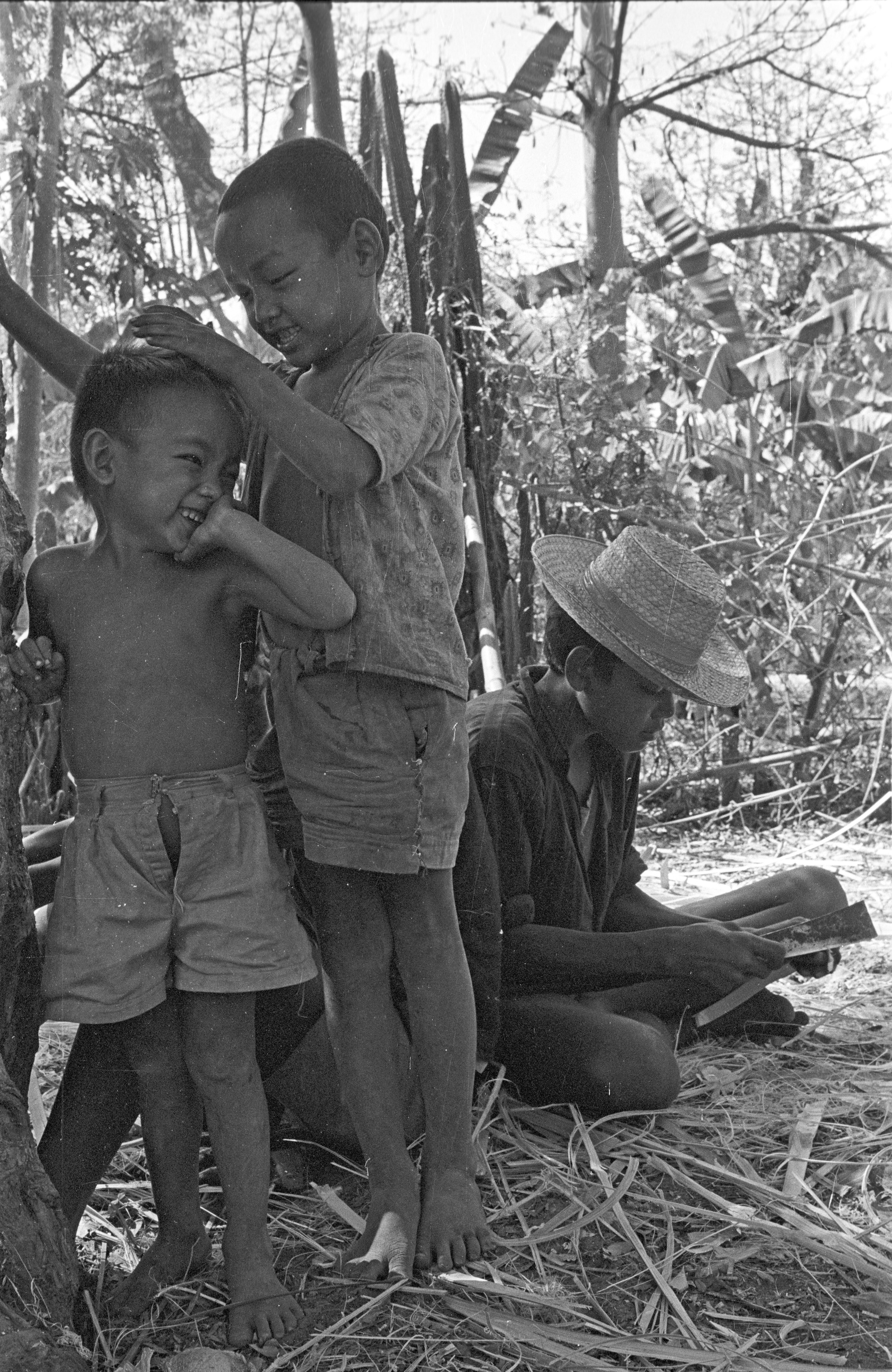 Children picking lice from one another's hair, Changwat Maha Sarakham, Thailand, January 1964