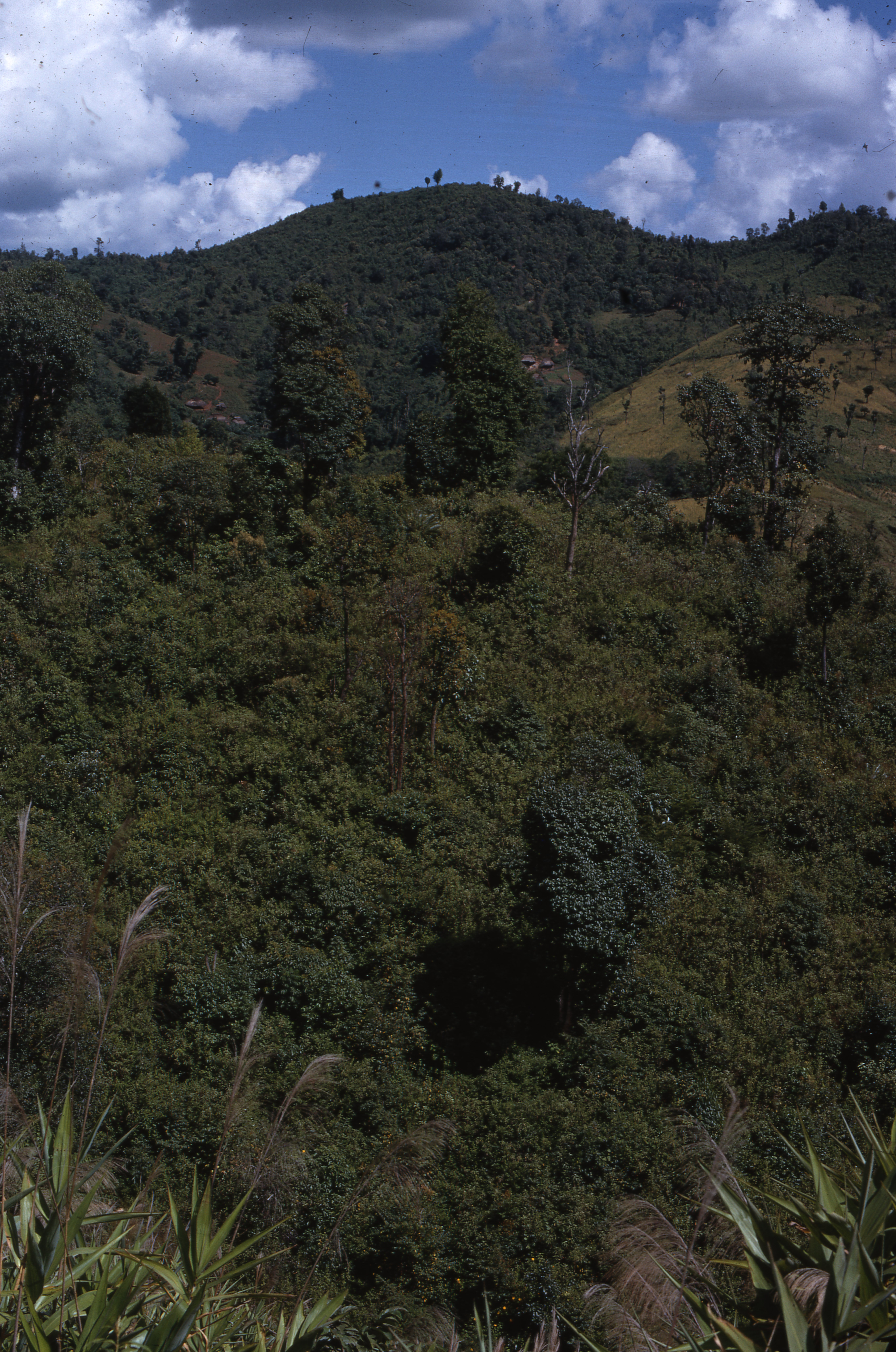 View of Bān Huai Kung from road with mixed vegetation in surrounding swidden fields, 4 photos, Thambon Pa Pong, Amphoe Sop Moei, Changwat Mae Hong Son, Thailand, October 1968