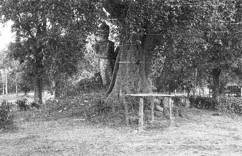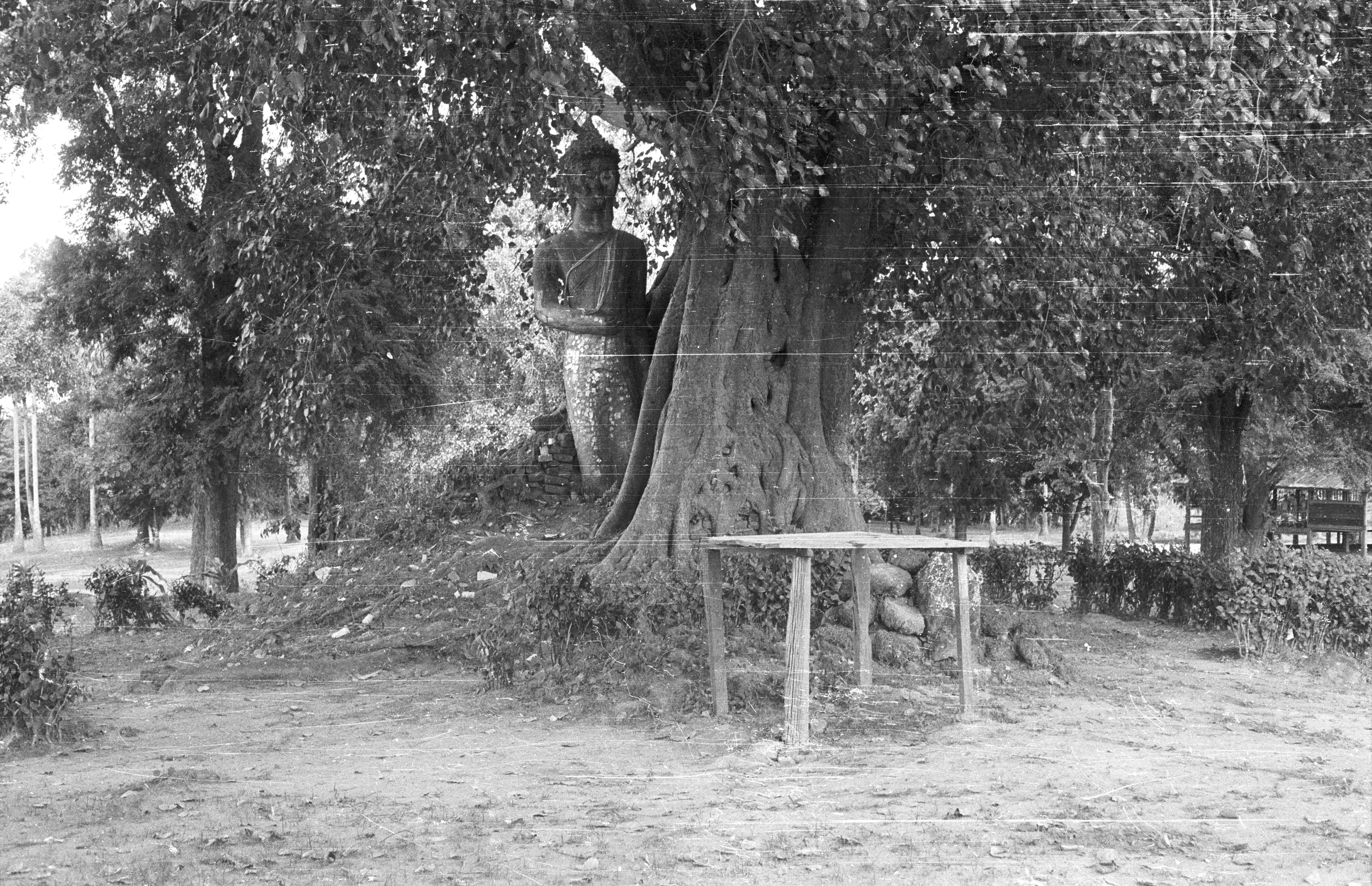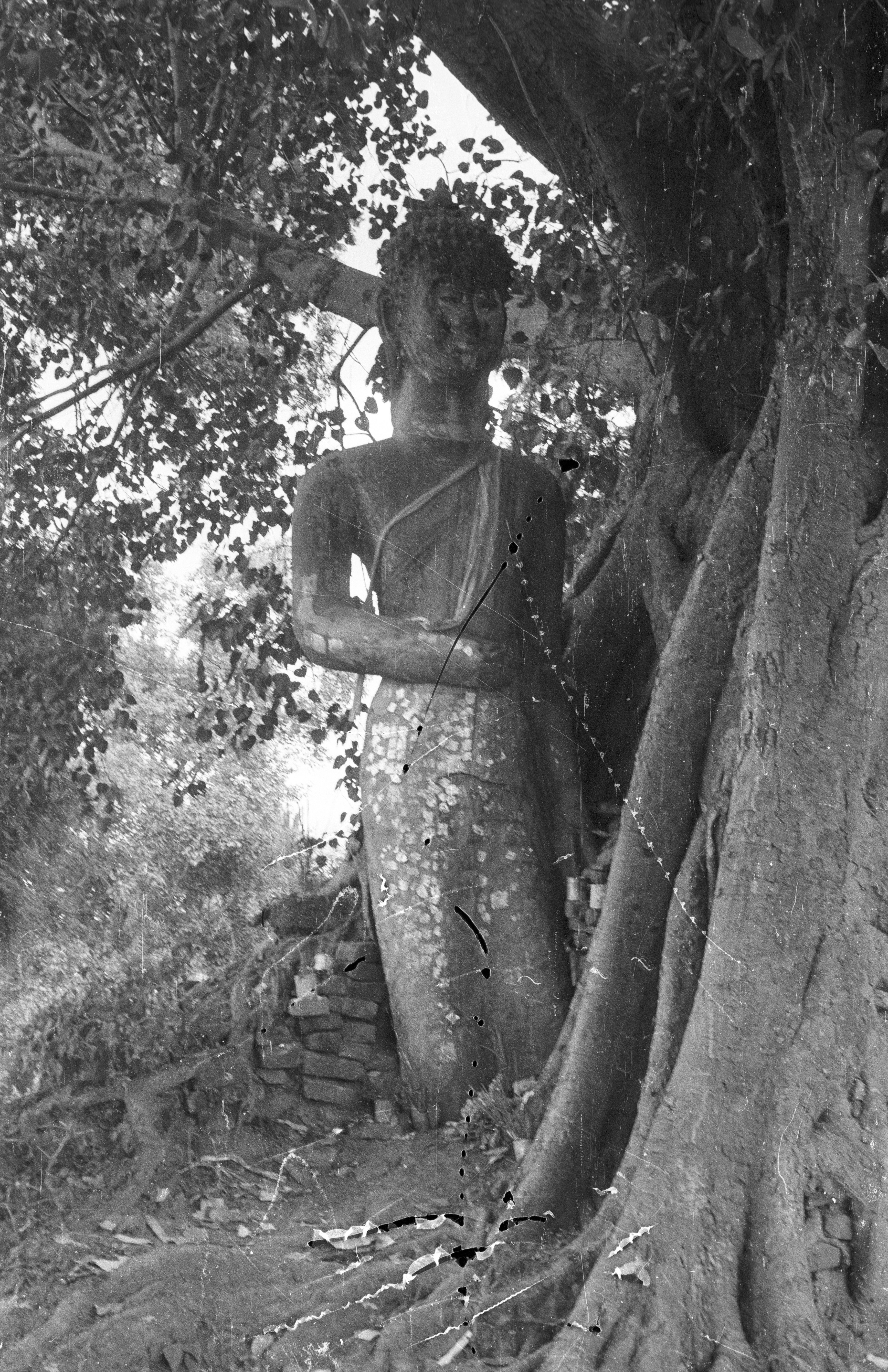 Standing image of the Buddha (Dvaravati) surrounded by Bodhi tree, 4 photos, Amphoe Kantharawichai, Changwat Maha Sarakham, Thailand, Thailand, November 1963