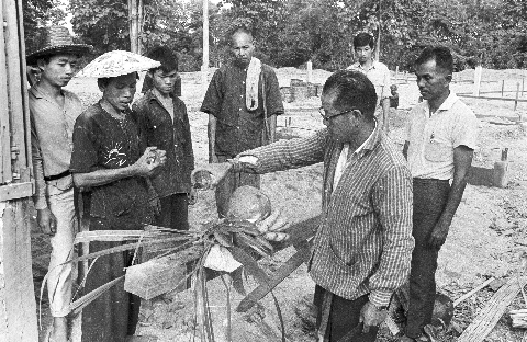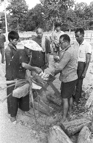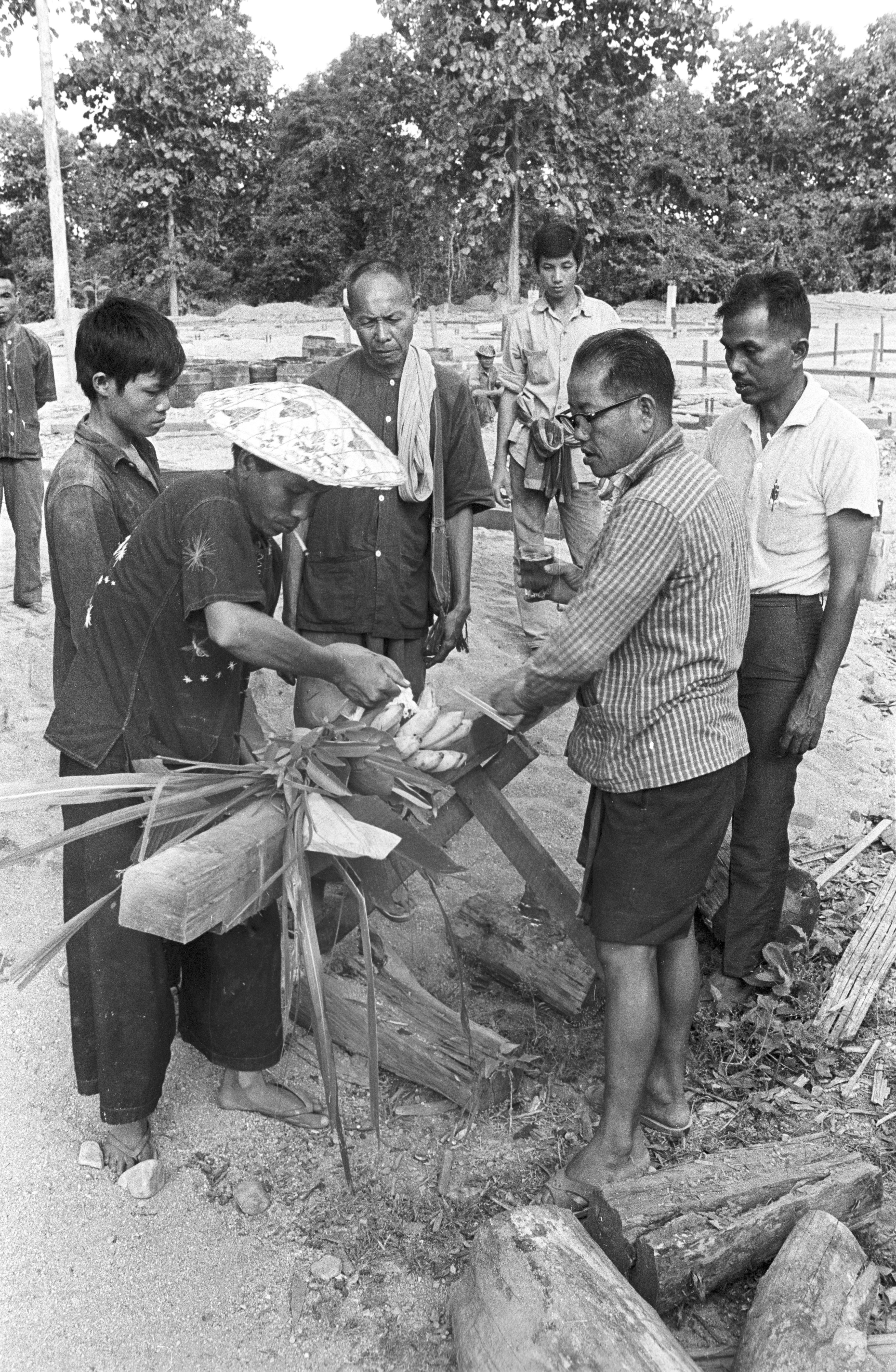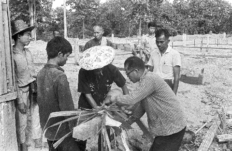 Customs relating to new building at tobacco drying station: blessing the first pole [sao haek?], 4 photos, Mae Hong Son Province, Thailand, November 1967