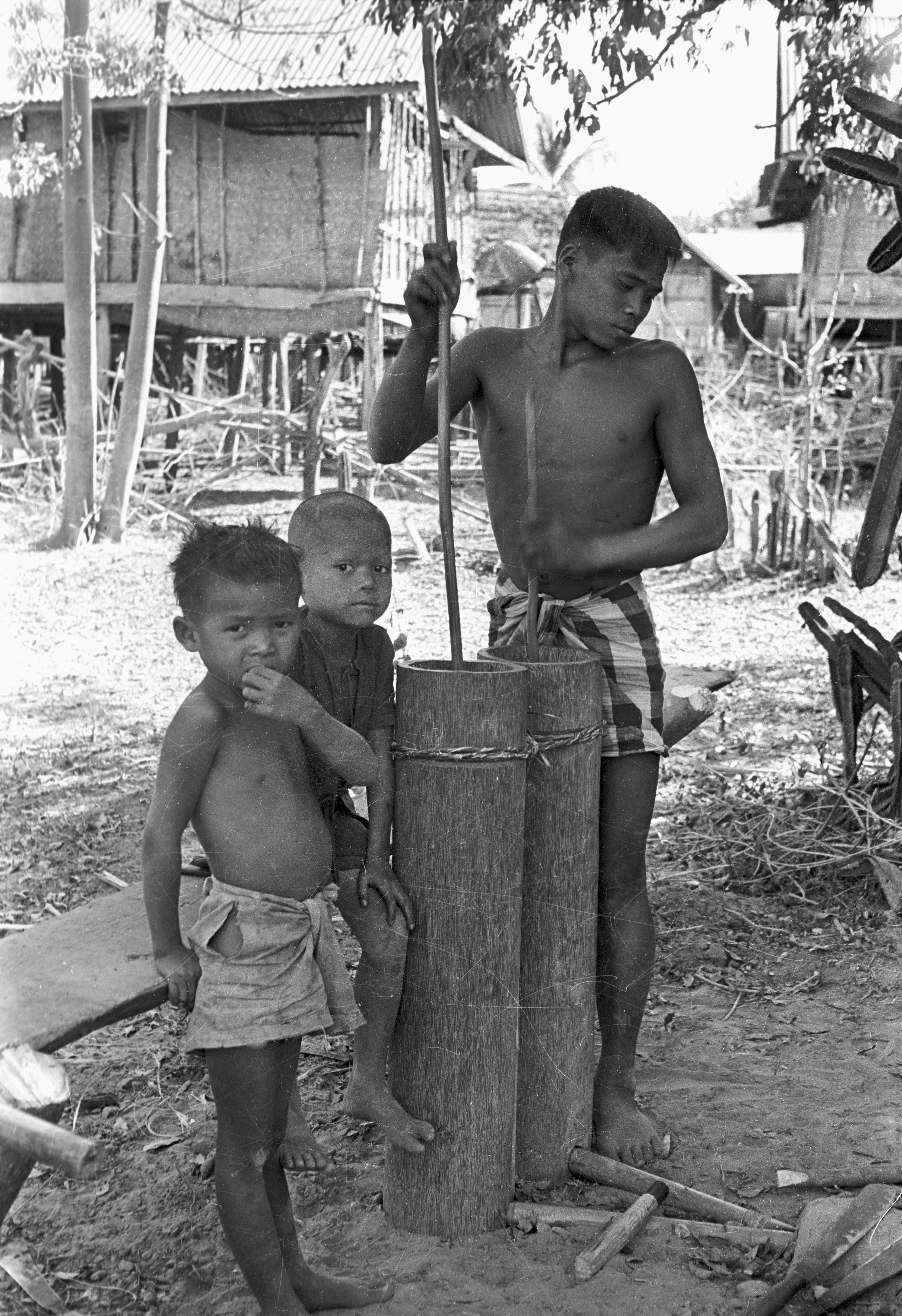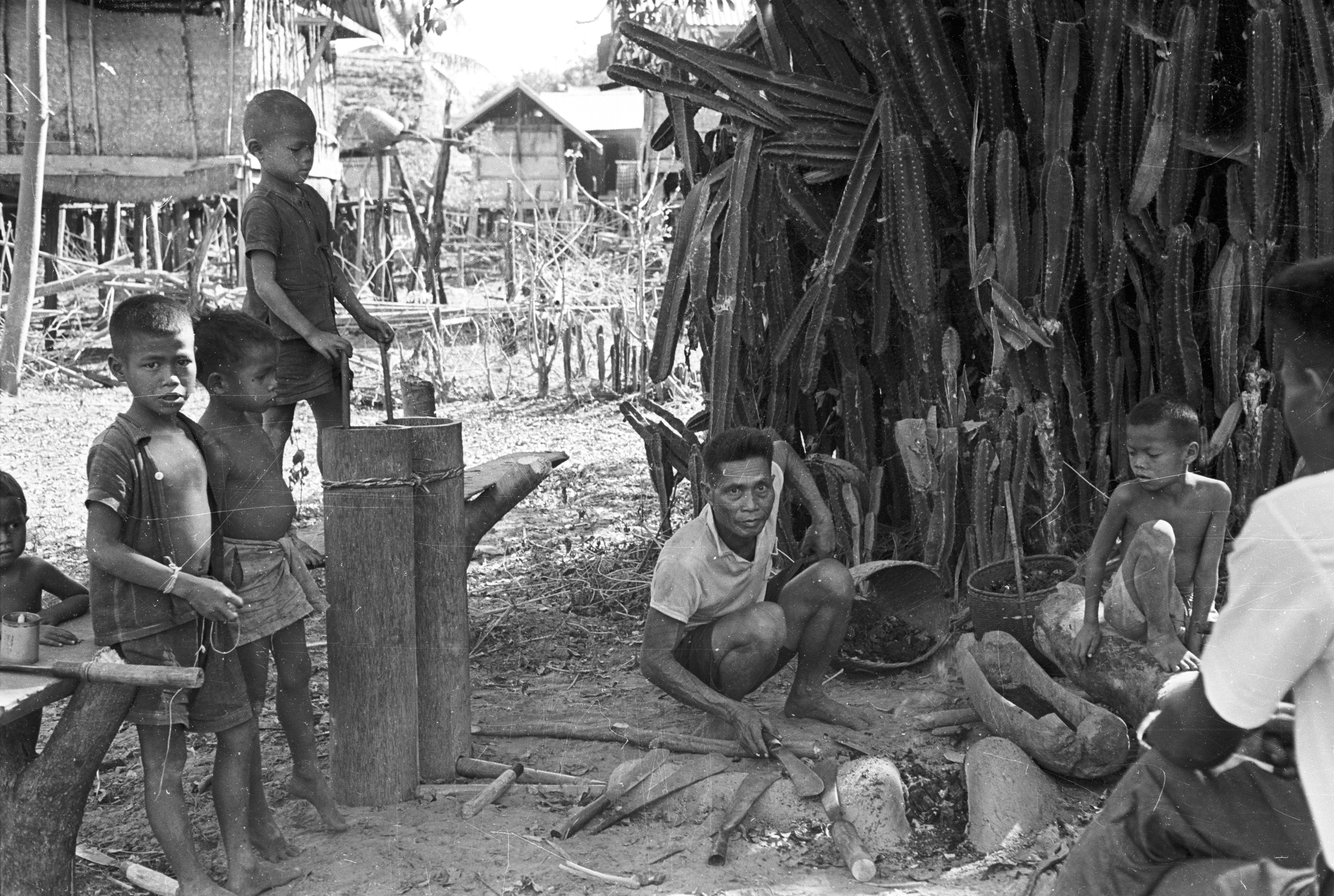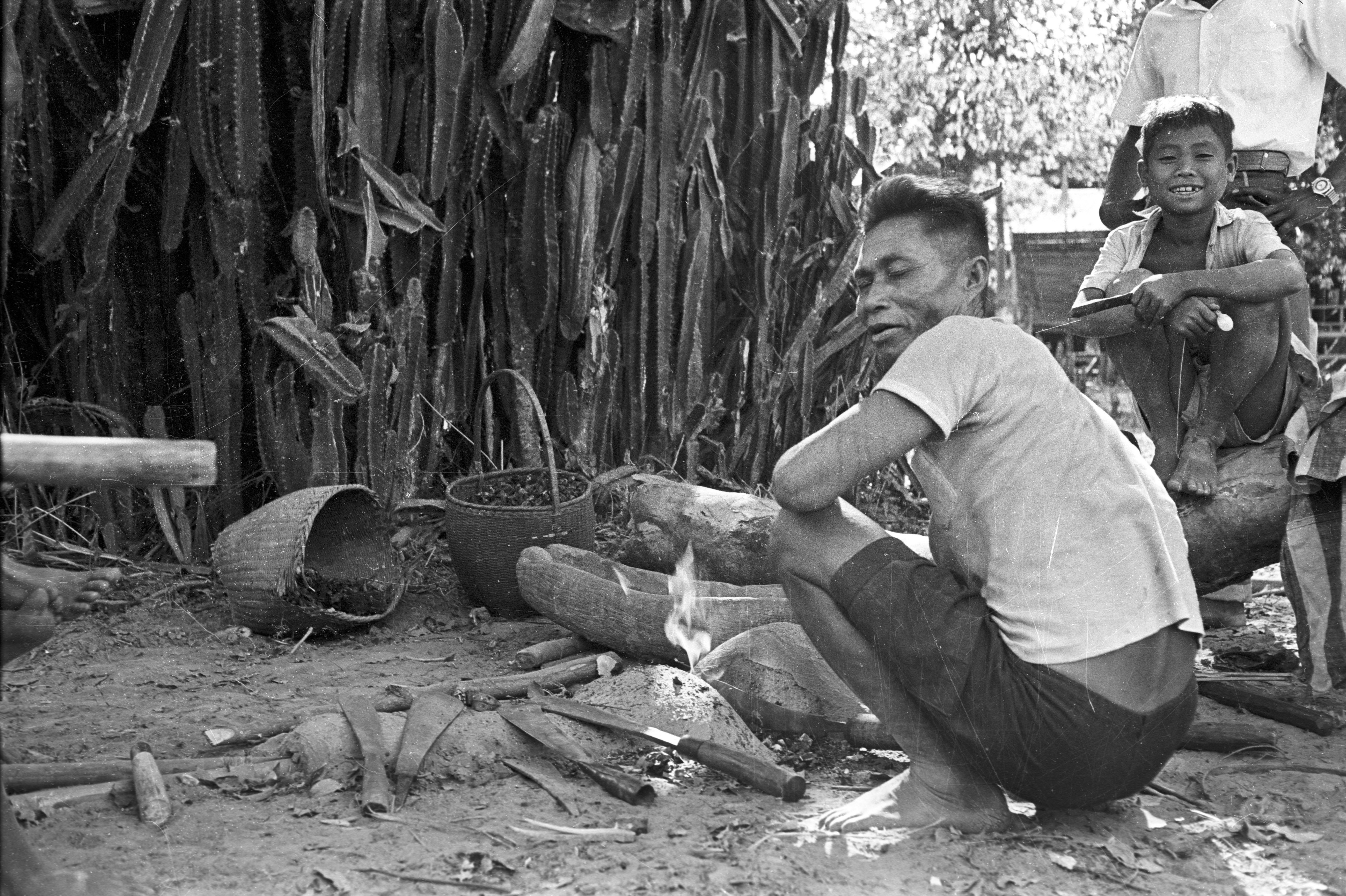 Village men and boys working a Malay bellows for a blacksmith, 4 photos, Changwat Maha Sarakham, Thailand, January 1964
