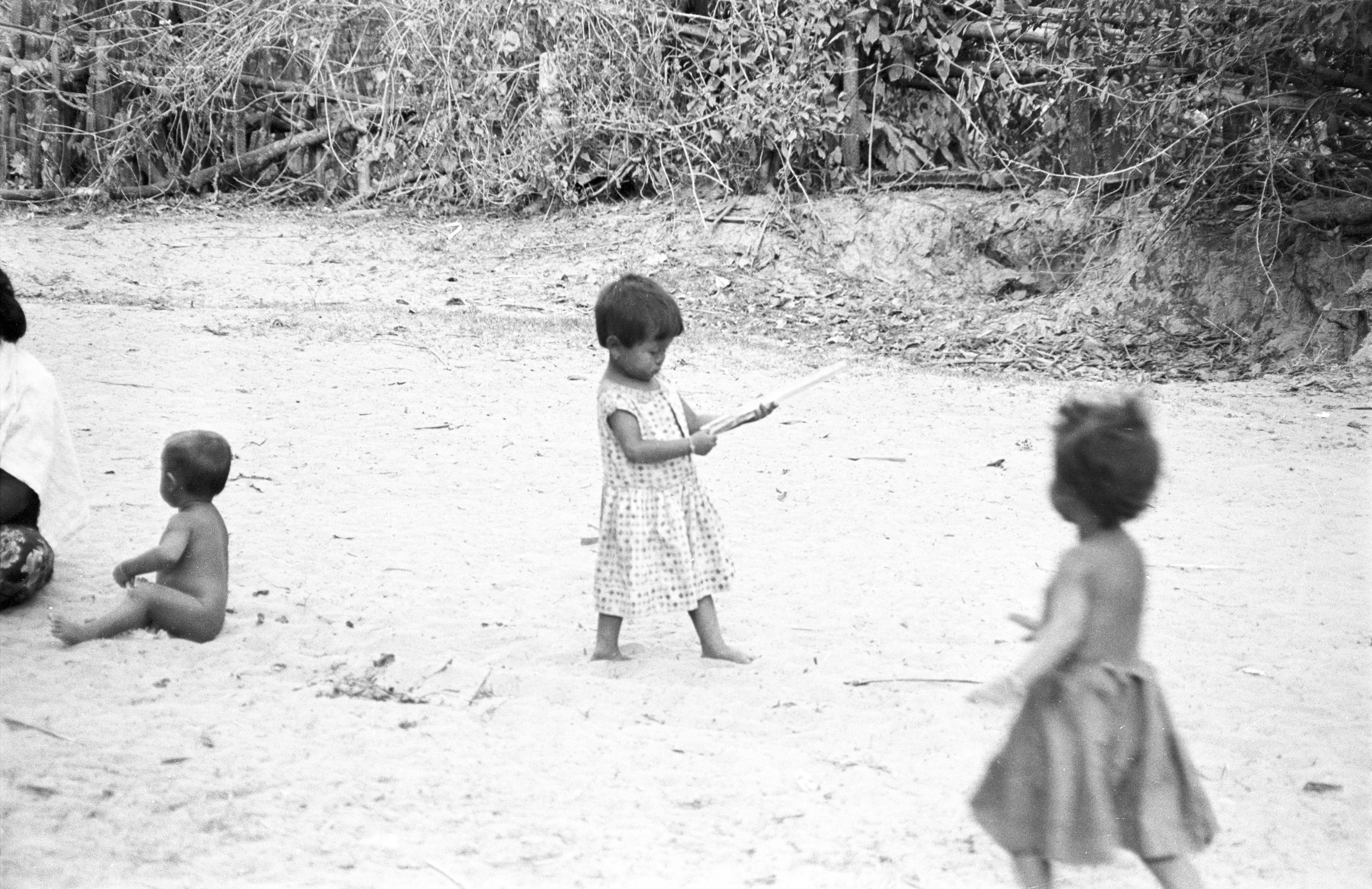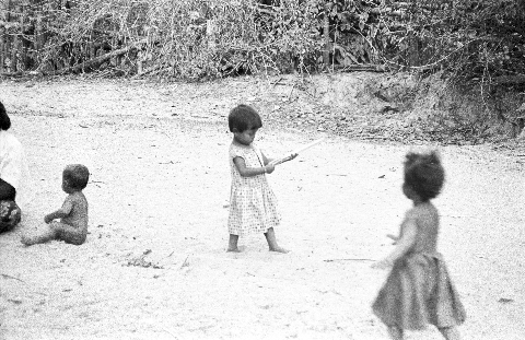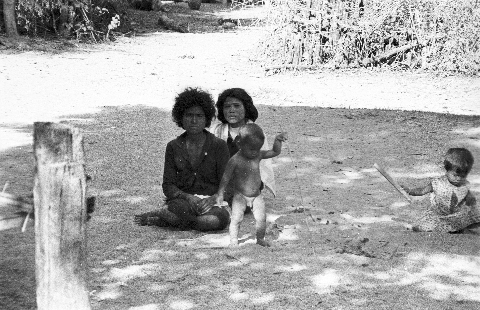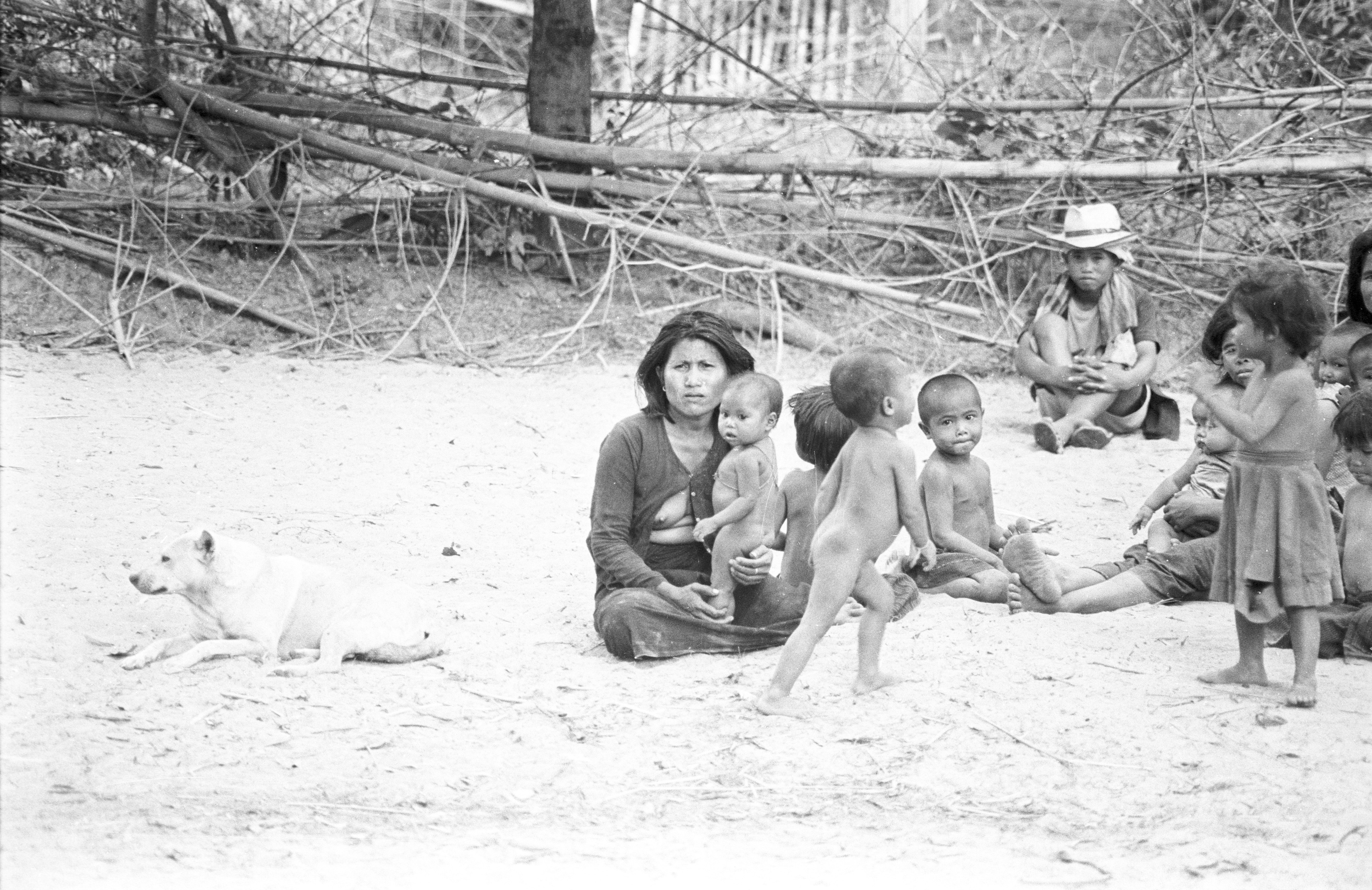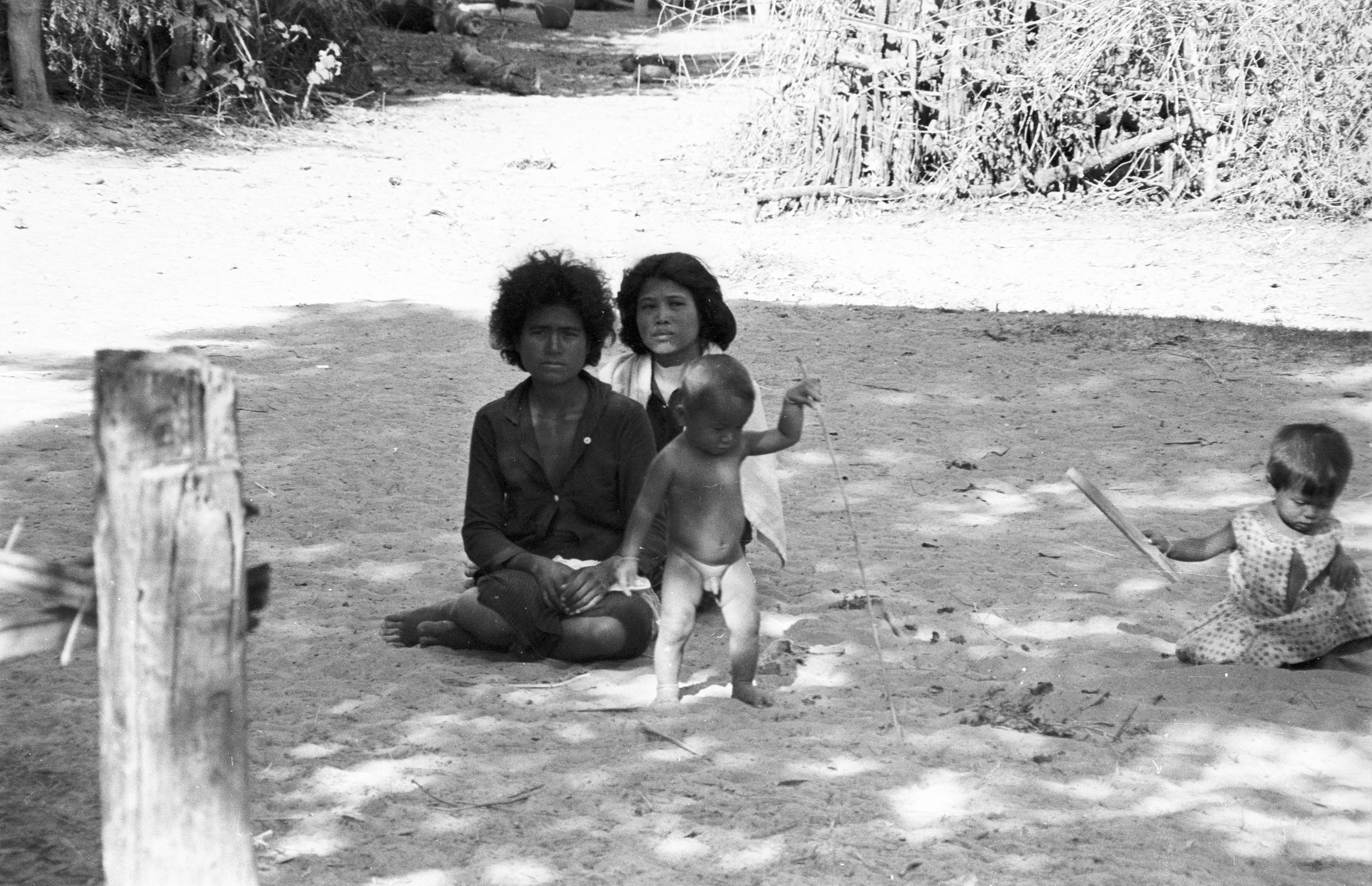 Village woman and children in front of our house, 3 photos, Ban Nong Tun, Amphoe Muang, Changwat Maha Sarakham, Thailand, December 1963