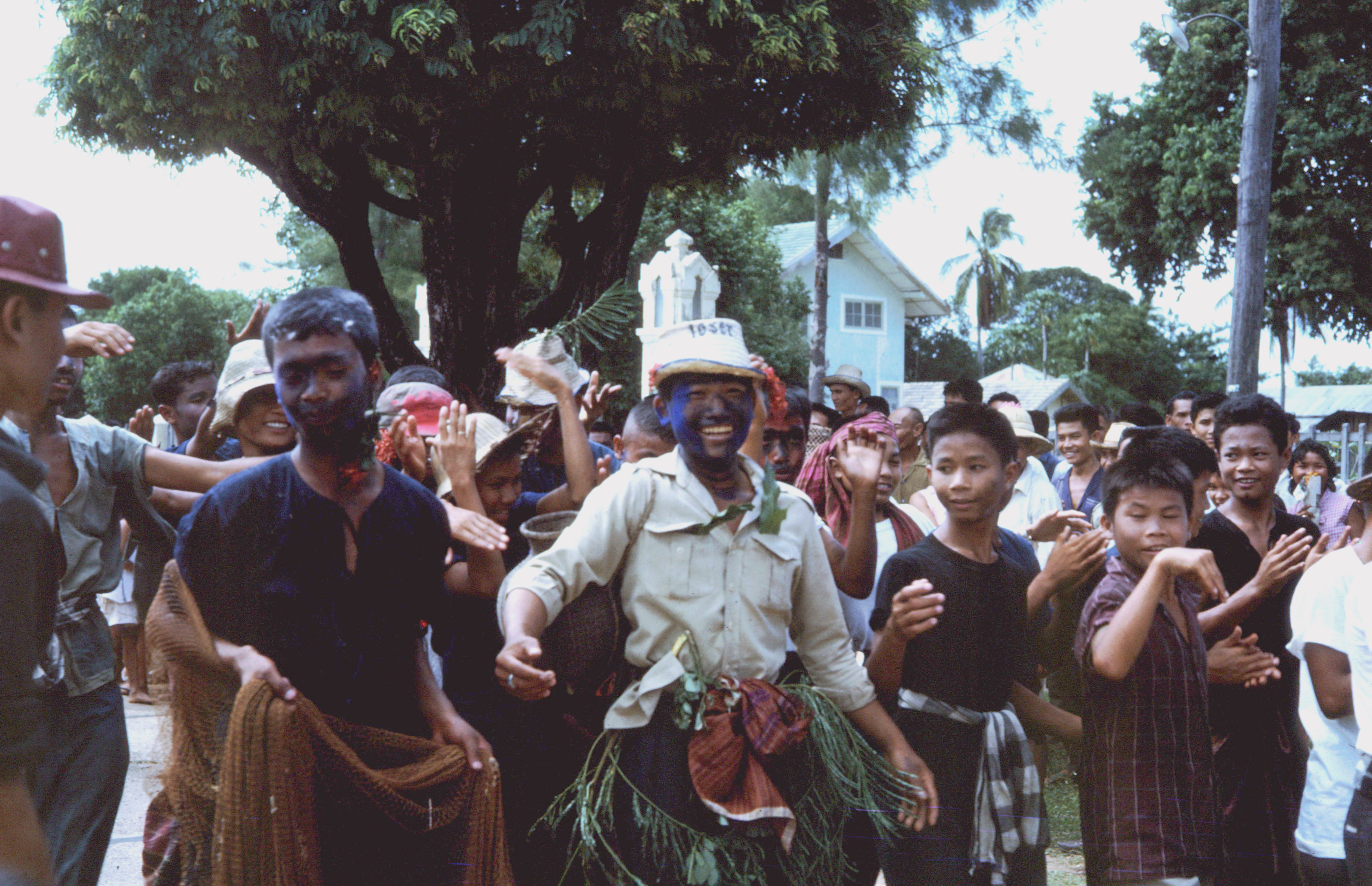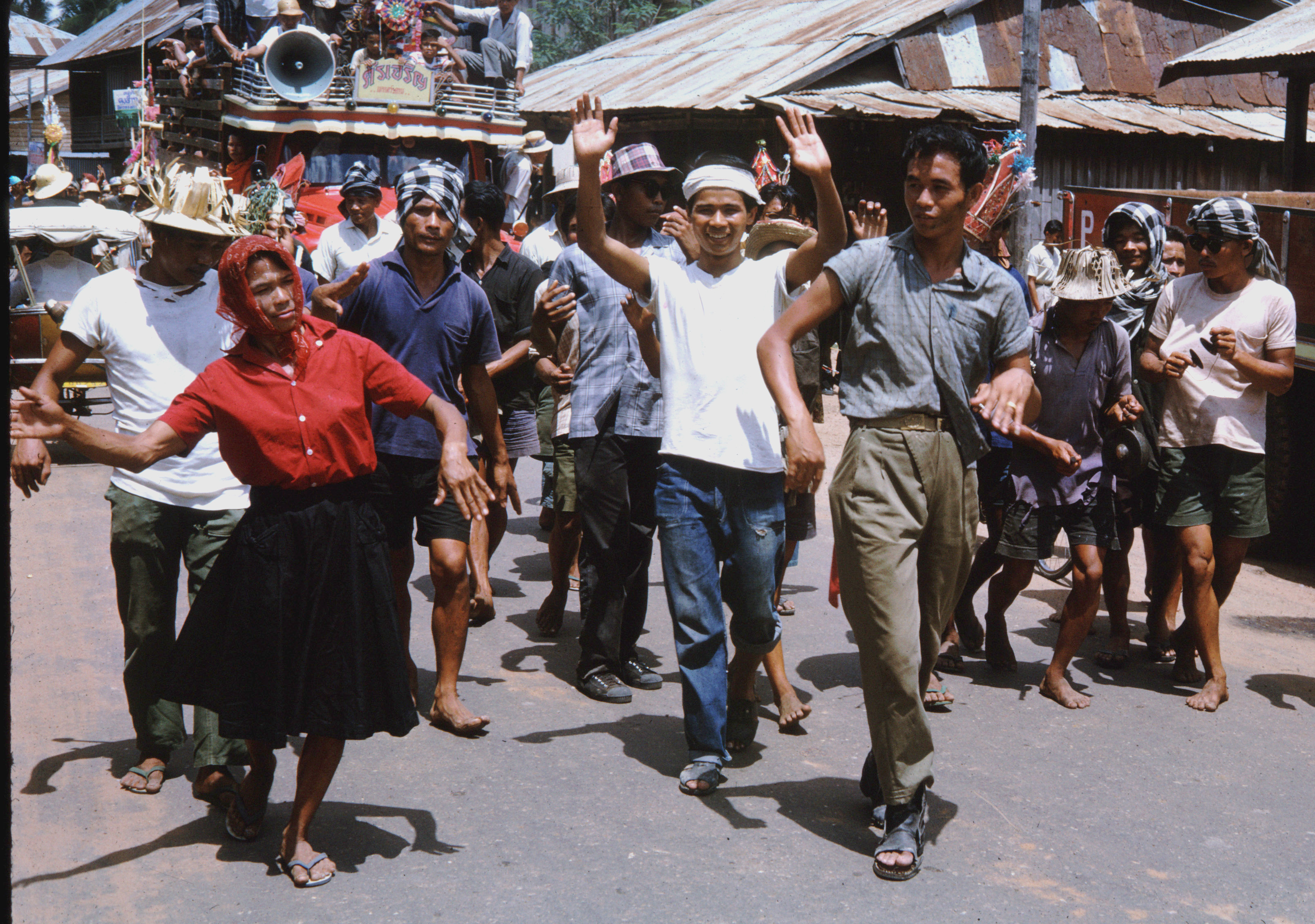 Fire Rocket Ceremony (bun bông fai) at which rockets are set off to inform the gods it is time to send the rains, 4 photos. Note the transvestite dress of the men. This is a ritual in which sexual symbolism is blatant.The festsival is of Khmer origin and is Hinduistic, rather than Buddhistic. Maha Sarakham town, Changwat Maha Sarakham, 1963 or 1964