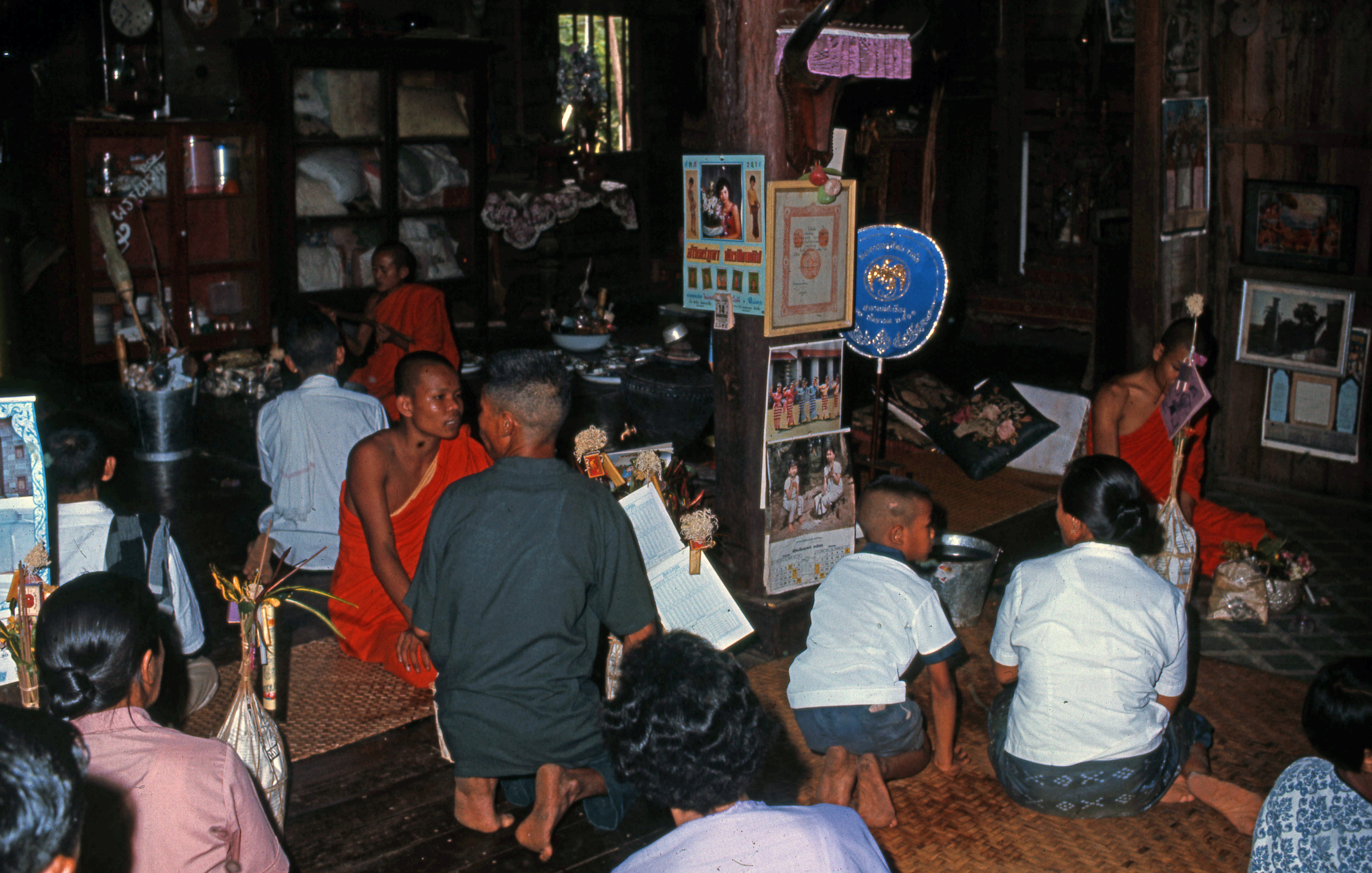 Kin Kuai Salāk (rite of distributing alms by lottery) at Wat Côm Thông – monks receiving offerings, Amphoe Mae Sariang, Changwat Mae Hong Son, Thailand, September 1968